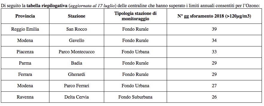In Emilia-Romagna sono già 7 le stazioni di monitoraggio dell’Ozono che hanno superato il limite normativo annuale dei 25 giorni di supermanto consentiti. La situazione peggiore nei capoluoghi emiliani: le centraline di Reggio Emilia, Modena e Piacenza hanno già abbondantemente superato i 30 gg di sforamento del limite di 120µg/m3 come media sulle 8 ore. Oltre i limiti anche Parma, Ferrara e Ravenna.