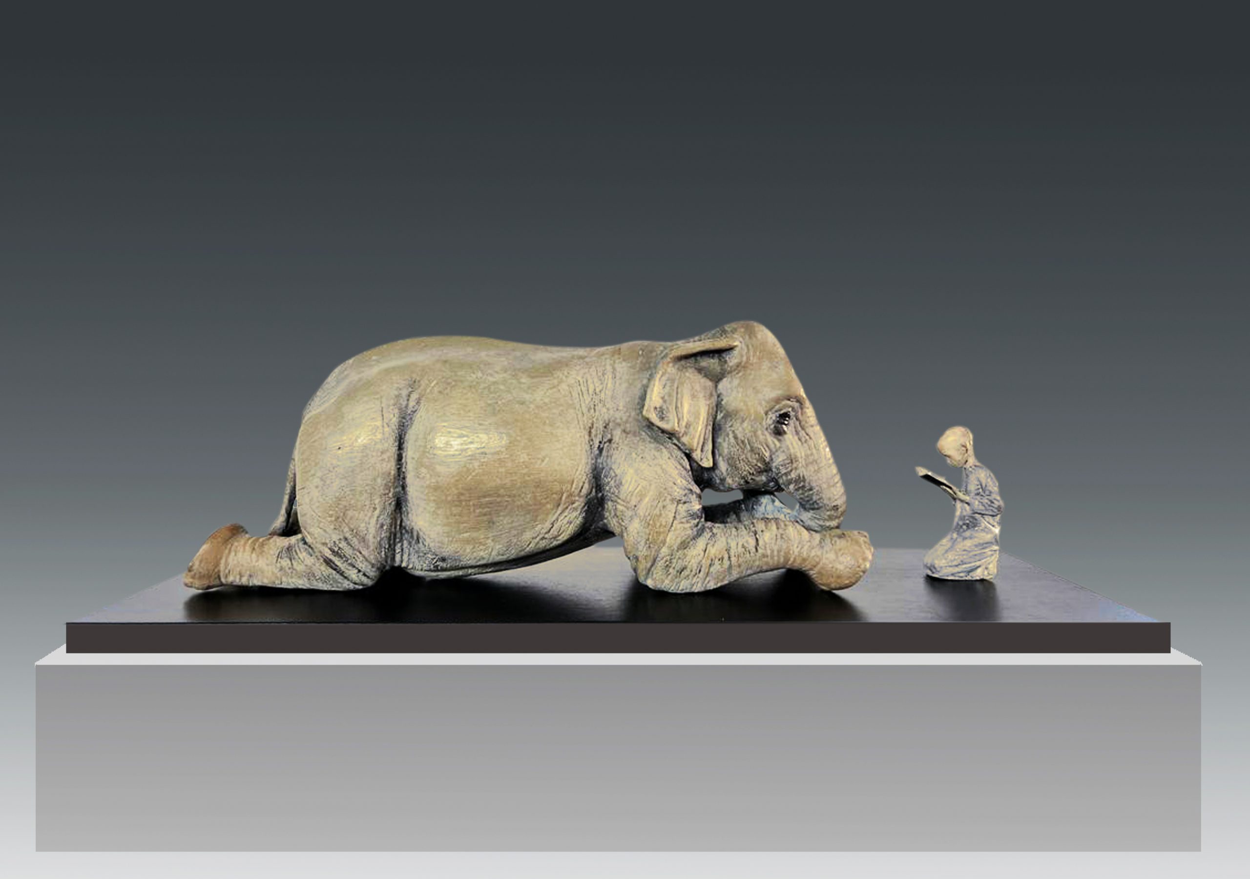 L’elefante si trova qui seduto di fronte a una figura che assomiglia a un monaco in preghiera diventa simbolo di buon auspicio e capacità di rimuovere gli ostacoli. Questa immagine offre una visione inclusiva e non gerarchica del mondo naturale, raffigurante un’interdipendenza e una simmetria tra l’umanità e il resto della vita.