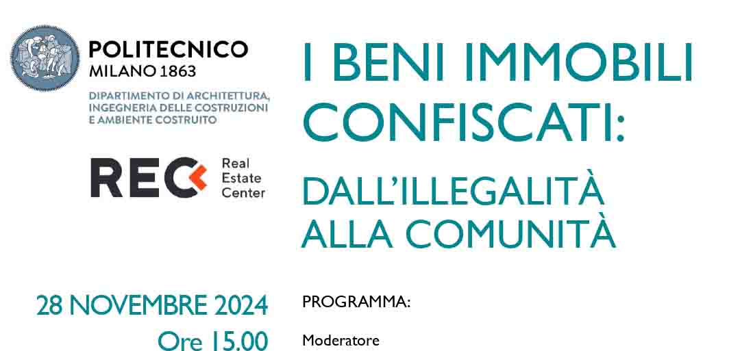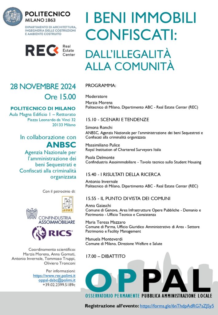 Vede il coinvolgimento del Politecnico di Milano di Rec – Real Estate Center, in collaborazione con ANBSC Agenzia Nazionale per l’amministrazione dei beni Sequestrati e Confiscati alla criminalità organizzata, con il patrocinio di Anci, Confindustria Assoimmobilare, Rics, con il coordinamento scientifico di Marzia Morena, Anna Gornati, Antonio Invernale, Tommaso Truppi, Oliviero Tronconi.