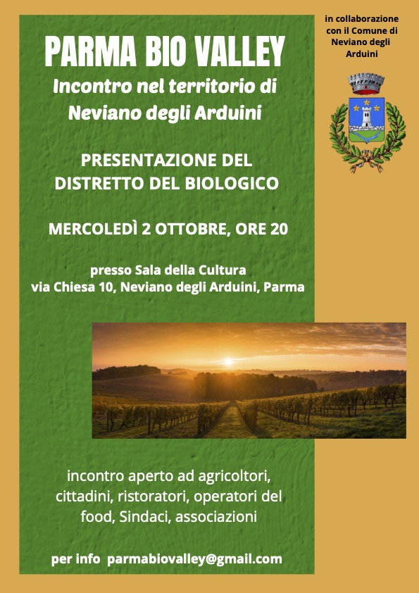 Il prossimo 2 Ottobre alle ore 20 presso la Sala della Cultura del Comune di Neviano degli Arduini, grazie alla collaborazione con l’Amministrazione, si terrà un incontro aperto a tutti durante il quale presenteremo Parma Bio Valley, mentre a metà Ottobre proseguirà il tavolo di lavoro dedicato alla filiera del grano: la prima filiera bio a cui ci stiamo dedicando. Per informazioni potete contattarci a parmabiovalley@gmail.com.