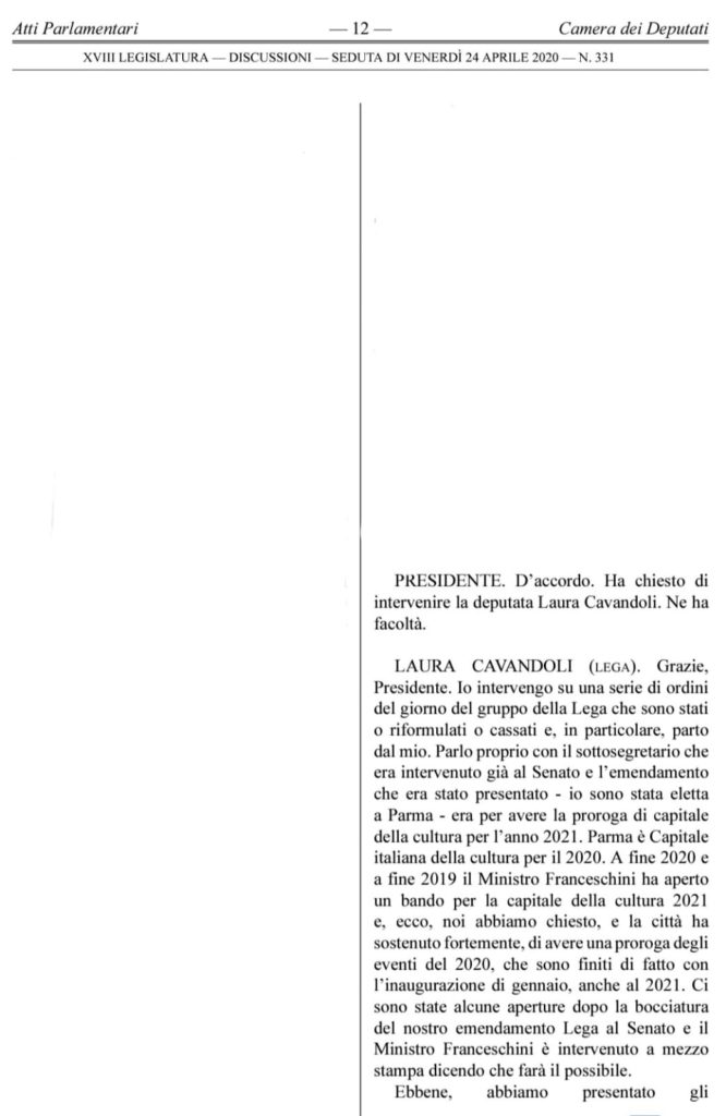 Parma capitale della Cultura anche per il 2021 è un’occasione di rilancio fondamentale della città, non può essere ostaggio dei giochetti politici di una maggioranza inadeguata a guidare il Paese.