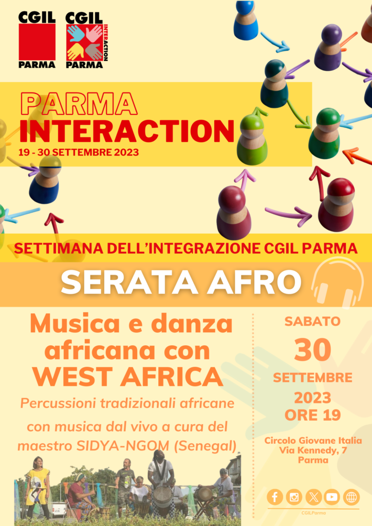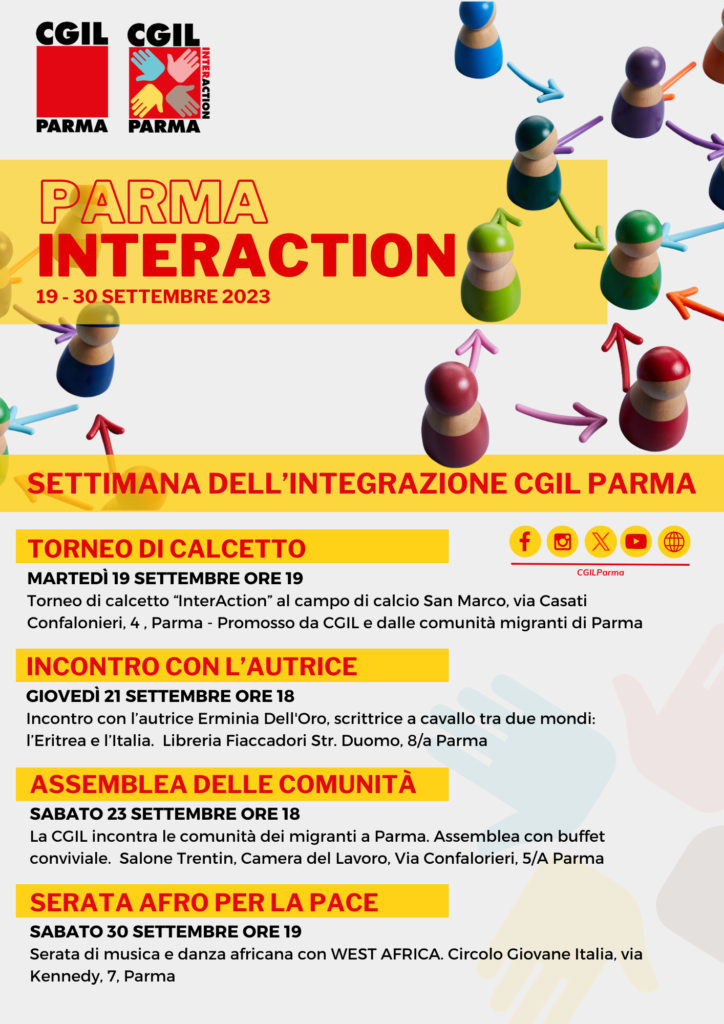 Si svolgerà dal 19 al 30 settembre PARMA INTERACTION, la “Settimana dell’integrazione” con cui, dopo la pausa forzata dovuta al covid, la CGIL Parma riprende a dialogare con le comunità straniere del territorio, per coinvolgerle e creare ponti in una serie di appuntamenti molto diversi tra loro.