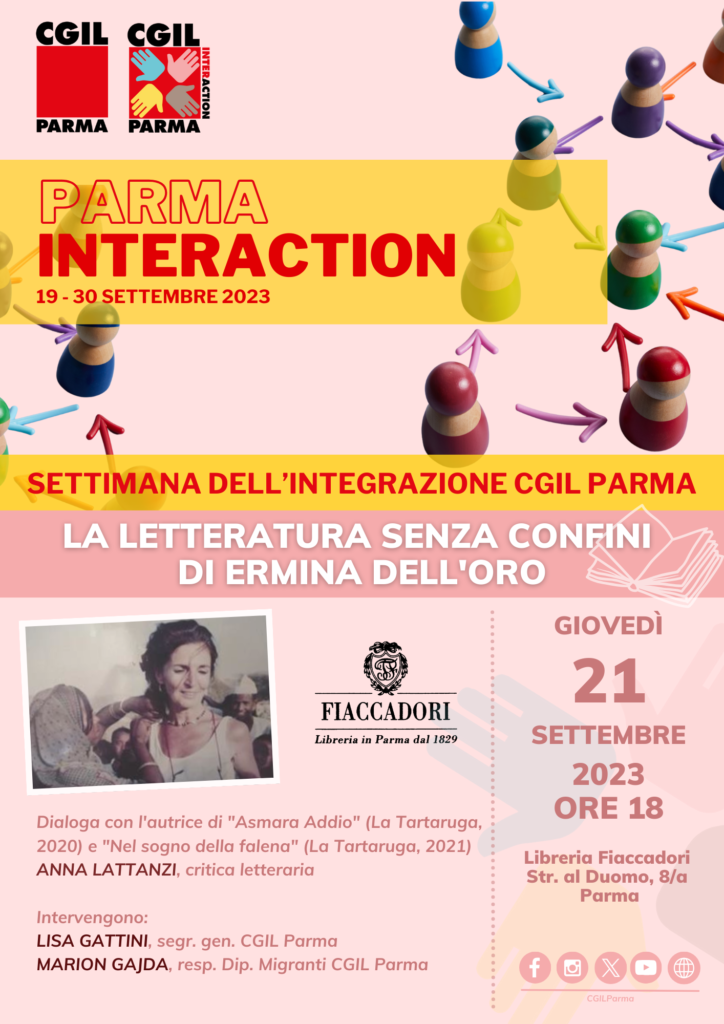 Giovedì 21 settembre sarà la volta dell’incontro con la letteratura senza confini di Erminia Dell’Oro, scrittrice a cavallo tra due mondi: l’Eritrea e l’Italia. Nella libreria Fiaccadori, in Str. Duomo, 8/a Parma, alle ore 18.00 la critica letteraria Anna Lattanzi dialogherà con l’autrice di “Asmara Addio” (La Tartaruga, 2020) e “Nel sogno della falena” (La Tartaruga, 2021). Interverranno Lisa Gattini, segretaria generale CGIL Parma, e Marion Gajda, responsabile Dipartimento Migranti CGIL Parma.