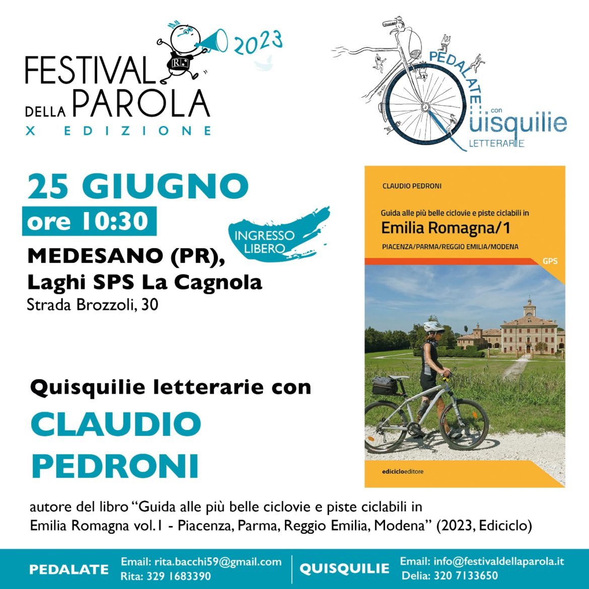 Il terzo appuntamento delle Pedalate con Quisquilie letterarie di questa X edizione del Festival della Parola di Parma ha come magico luogo di destinazione, domenica 25 giugno, i Laghi SPS La Cagnola di Medesano (PR), in Strada Brozzoli, 30. È qui, nella particolare cornice del Parco fluviale regionale del Taro, un’area in cui sono stati recuperati habitat che ospitano specie di interesse conservazionistico, che alle ore 10.30 sarà possibile assistere alle Quisquilie letterarie con CLAUDIO PEDRONI, autore del libro “Guida alle più belle ciclovie e piste ciclabili in Emilia Romagna vol.1 – Piacenza, Parma, Reggio Emilia, Modena” (2023, Ediciclo). In anteprima Pedroni, che percorrerà insieme ai cicloamatori accompagnati dalla dalla FIAB il percorso della Pedalata, presenterà anche il volume 2 che comprende tutte le altre province della regione.