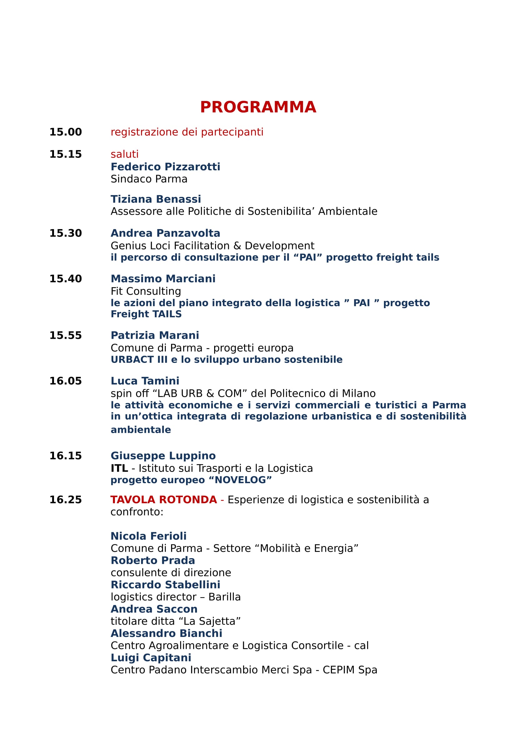 Il programma della giornata prevede, alle 15, il saluto del sindaco Federico Pizzarotti e dell’assessore alle Politiche di Sostenibilità Ambientale, Tiziana Benassi. Alle 15.30 Andrea Panzavolta di “Genius Loci Facilitation & Development” parlerà del percorso di consultazione per il “PAI” progetto Freight Tails; alle 15.40 Massimo Marciani, Fit Consulting, concentrerà il proprio intervento su: “Le azioni del piano integrato della logistica “PAI” progetto Freght Tails. Alle 15.55, Patrizia Marani dell’Ufficio Progetto Europa del Comune parlerà di URBACT III e lo sviluppo urbano sostenibile. Luca Tamini, spin off “LAB URB & COM” del Politecnico di Milano approfondirà il tema: “Le attività economiche e i servizi commerciali e turistici a Parma in un’ottica integrata di regolazione urbanistica e di sostenibilità ambientale”. Alle 16.15, Giuseppe Luppino, ITL – Istituto sui Trasporti e la Logistica, approfondirà il progetto europeo: “NOVELOG”. Alle 16.25, tavola rotonda con Nicola Ferioli, dirigente del settore mobilità del Comune, Roberto Prada consulente di direzione, Riccardo Stabellini Logistics Director – Barilla, Andrea Saccon titolare ditta “La Sajetta”, Alessandro Bianchi del Cal – Centro Agroalimentare e Logistica Consortile e Luigi Capitani Centro Padano Interscambio Merci spa – CEPIM Spa.