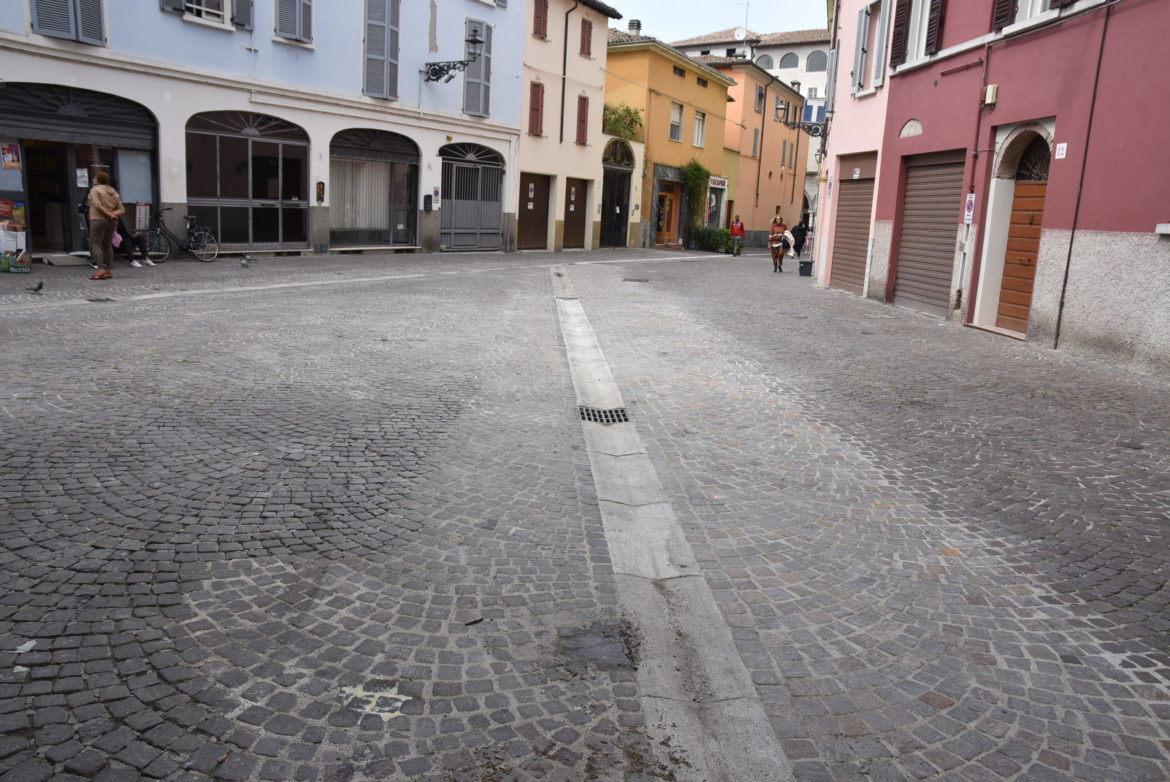 Le canaline precedenti, realizzate in lastre di pietra di Apricena, hanno mostrato limiti di resistenza ai cicli di gelo e disgelo tipici del clima invernale parmigiano. Questo ha comportato un degrado che ha reso necessaria la sostituzione per evitare rischi per la circolazione.