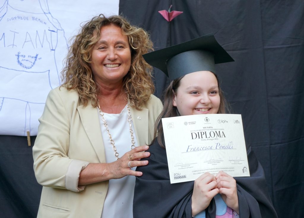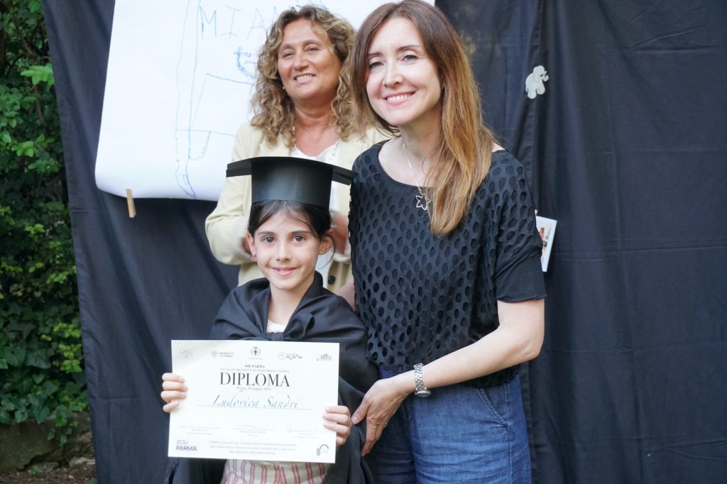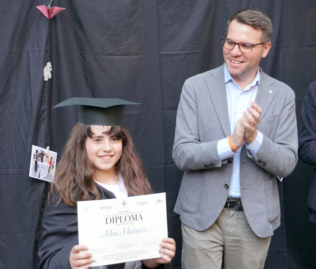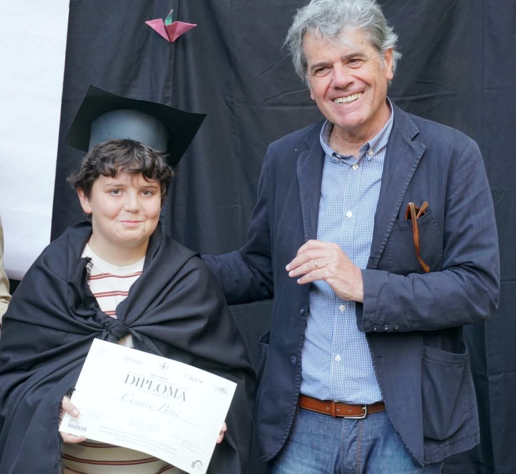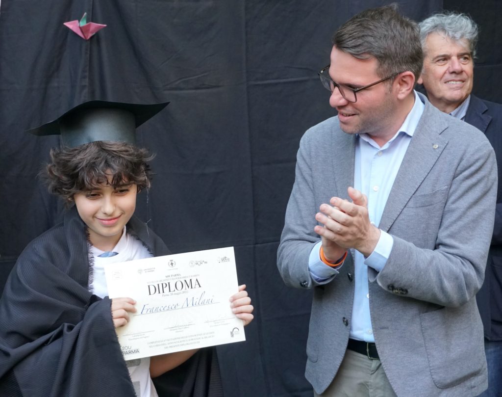 Infine, è stato il momento della consegna dei diplomi direttamente dalle mani delle autorità cittadine. Chiara Vernizzi, assessora alla Rigenerazione urbana, ha dichiarato che “la seconda edizione di SOU, sostenuta con convinzione all’Amministrazione di Parma, ha confermato l’importanza di avvicinare i bambini ai temi dell’architettura e della bellezza, per educare tutti al rispetto e alla valorizzazione dei luoghi e degli spazi nei quali tanta parte della nostra e della loro vita si svolgerà”. Francesco De Vanna, Assessore ai Lavori Pubblici e Legalità, ha espresso “molti complimenti per un bellissimo percorso di sensibilizzazione verso lo spazio pubblico che deve maturare anche in noi adulti. Ancora una volta una testimonianza di come per educare un bambino serva un villaggio”. Daniele Pezzali, ex presidente dell’Ordine degli Architetti PPC di Parma, ha espresso gratitudine con queste parole: “Sono molto soddisfatto di chiudere il mio mandato e allo stesso tempo festeggiare la fine dell’anno della scuola d’architettura perché vedo che questa iniziativa, già sostenuta dall’Ordine, proseguirà sempre in meglio. L’attività che svolge, portando attenzione al paesaggio e allo spazio pubblico, è davvero importante per sensibilizzare la società”. Barbara Gherri, professore associato, rappresentante per l’Università di Parma, ha concluso dicendo che “temi come la bellezza, la funzione, l’attenzione per l’ambiente e alla responsabilità sociale, così alti e complessi, sono stati colti dai bambini e delle bambine con semplicità e vivo interesse. La loro perspicacia e l’attenzione ai dettagli ci hanno sorpreso lezione dopo lezione, dandoci nuovi spunti per la prossima edizione”.
