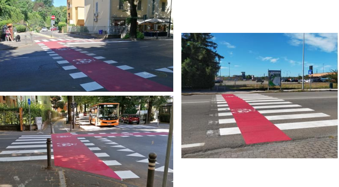 Le modifiche agli attraversamenti ciclopedonali sono state pensate con l’inserimento di segnaletica orizzontale bicolore o rialzando la zona di attraversamento, in modo da renderle ancora più visibili pedoni e ciclisti in procinto di attraversare.