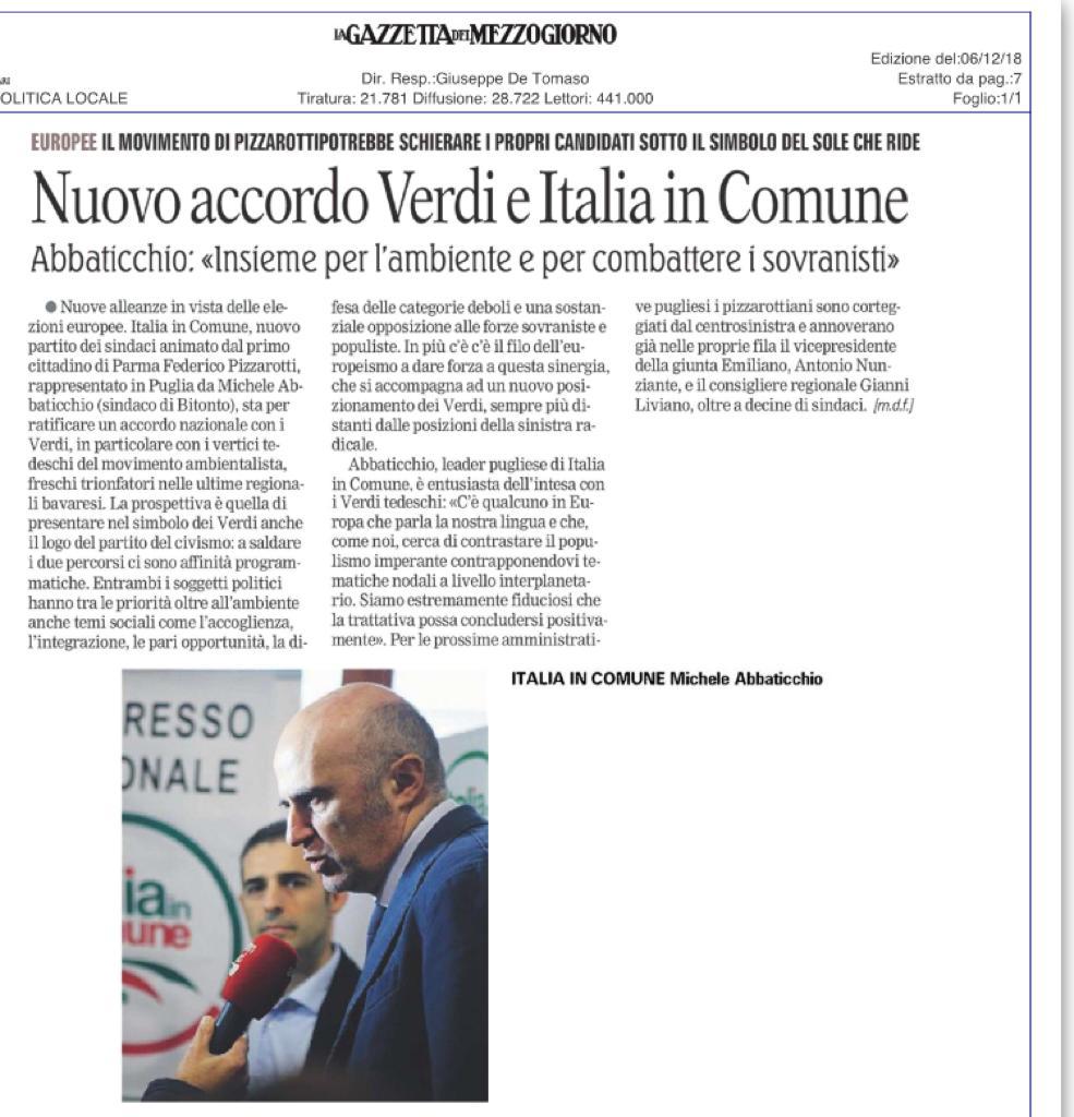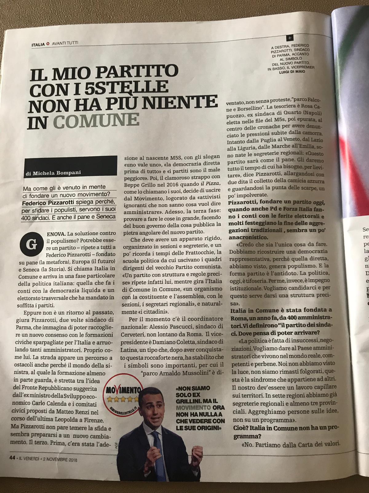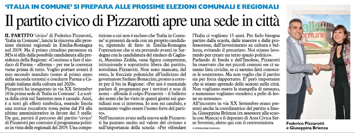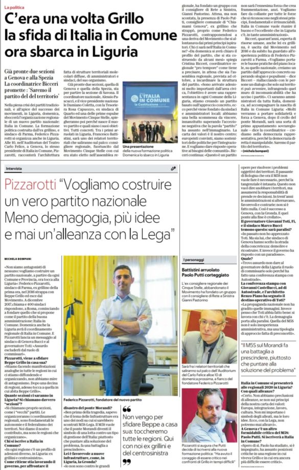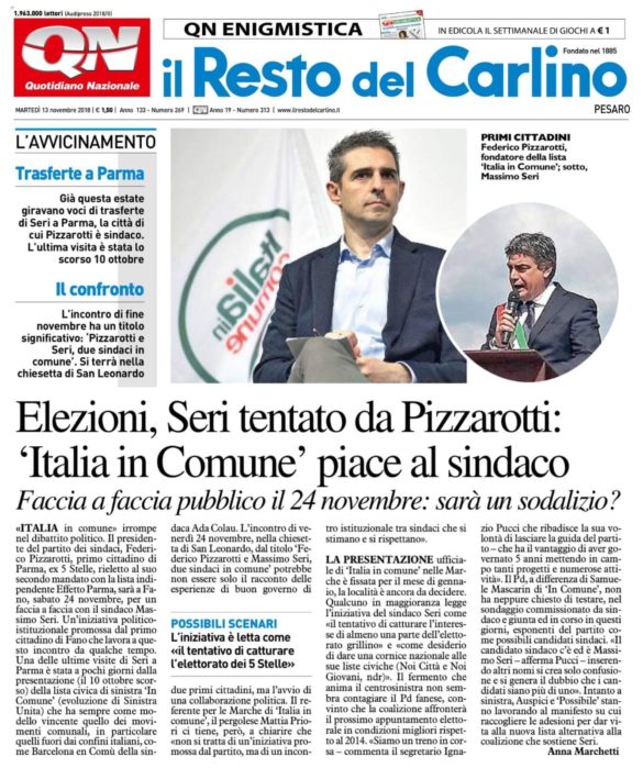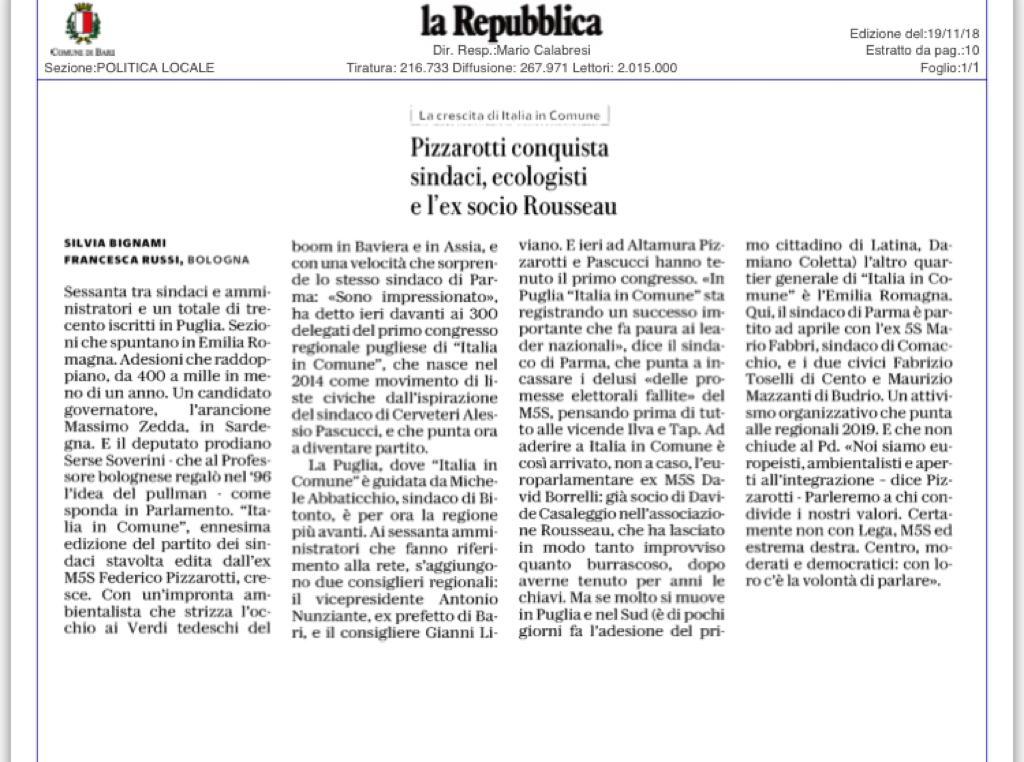 Questo posizionamento nazionale di Italia in Comune è stato possibile con la sola immagine di Pizzarotti, perchè di contenuti politici finora non se ne sono visti, se non generici appelli all’europeismo, all’accoglienza e alla saggezza del padre di famiglia o le solite critiche alla Lega. Pizzarotti gode di alta considerazione a livello nazionale, molto più che nella sua città: è riconosciuto come l’unico che prima è riuscito a sconfiggere Grillo nello sconto mediatico, e poi alle urne riducendo il M5S cittadino al 3%, da solo contro tutti, centrodestra e centrosinistra. E quello che ha mandato a casa per due volte il Pd nell’Emilia rossa. E’ passato come il buon amministratore che ha risanato una città sull’orlo del default e l’ha portata a essere Capitale italiana della Cultura. Si presenta in televisione con la faccia pulita e un po’ sbarazzina, giovane, esperto ma politicamente vergine. Tutti lo cercano, tutti lo invitano ai convegni e alle feste di partito.