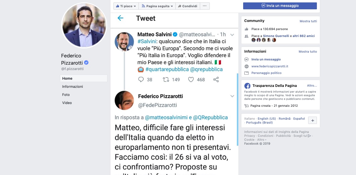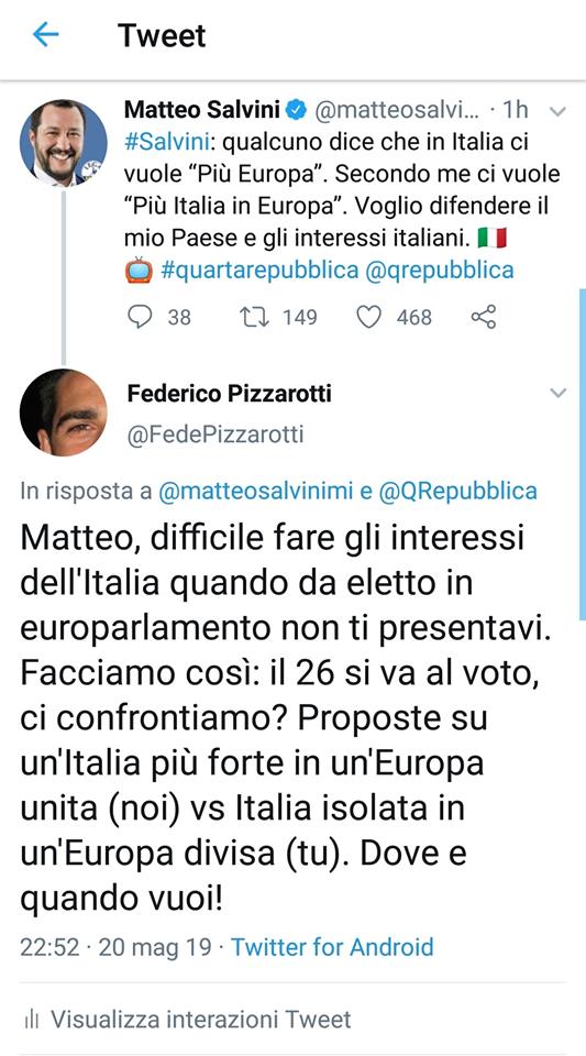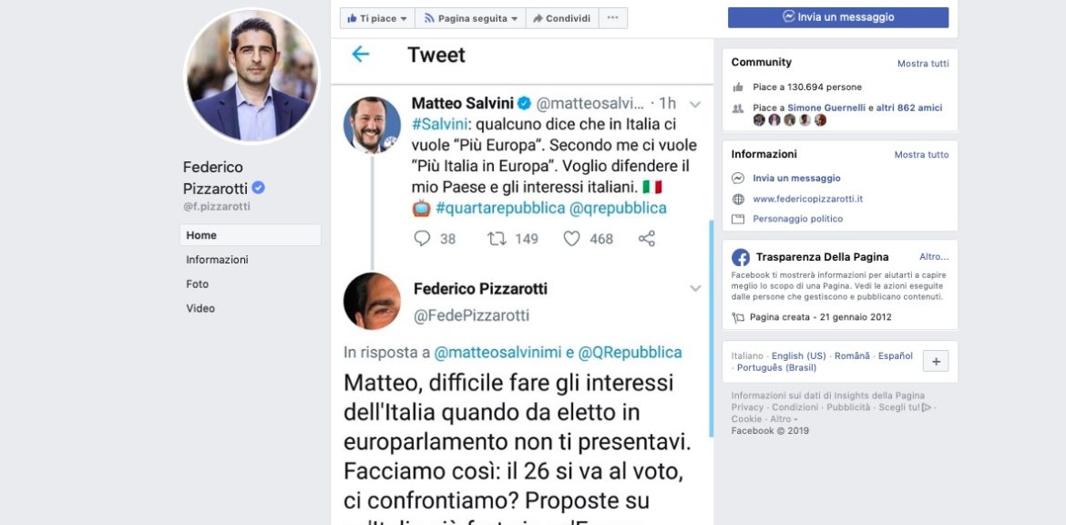 Pizzarotti sfida Salvini a un faccia a faccia sull’Europa: “Dove e quando vuoi” di UG 21 Maggio 2019 21 Maggio 2019 98 Federico Pizzarotti, candidato alle europee per +Europa, sfida Salvini a un confronto sul tema dell’Italia in Europa. Lo fa con un post.