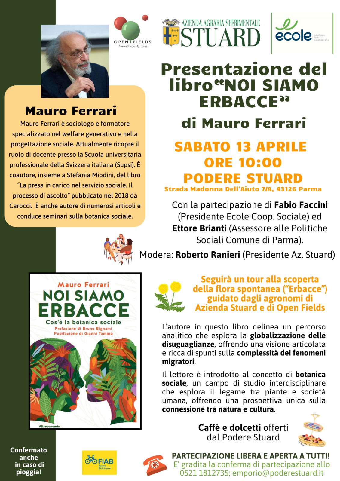 L’incontro inizierà alle ore 10, quando, accompagnati da un caffè o una bevanda calda e gustando la deliziosa colazione offerta dal Podere Stuard, Ferrari presenterà il suo libro “Noi siamo erbacce”, supportato nella riflessione da Fabio Faccini (presidente Cooperativa Sociale Ecole) ed Ettore Brianti (Assessore alle Politiche Sociali del Comune di Parma). A fare gli onori di casa Roberto Ranieri, presidente del Podere Stuard.