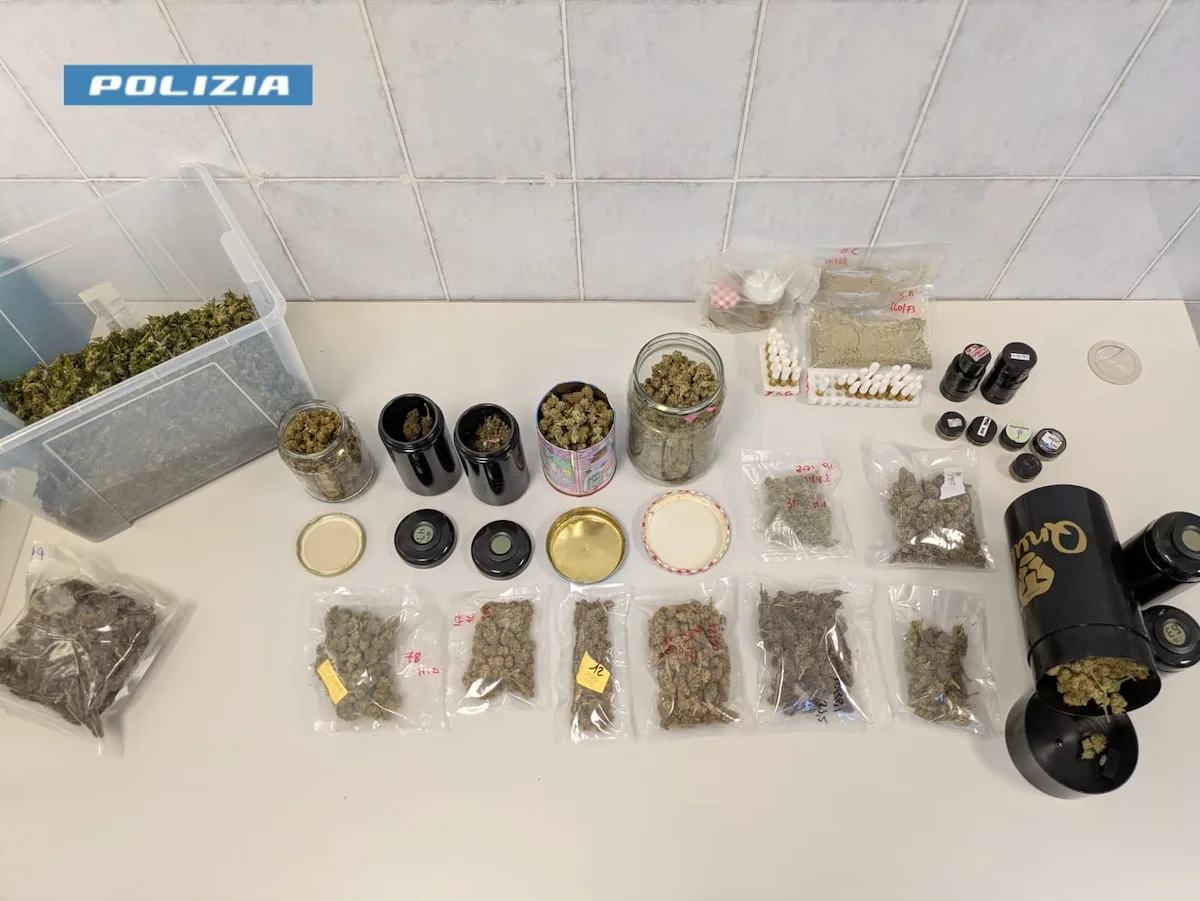Complessivamente sono stati sequestrati 3,587 kg di marijuana, 70 piante, di cui 27 con infiorescenze, 95 flaconcini contenenti liquido a base di marijuana per sigarette elettroniche, 16 vasetti contenenti sostanza solida derivata dalla marijuana, una pressa per l’estrazione della resina, nonché materiale per la lavorazione e il confezionamento dello stupefacente.