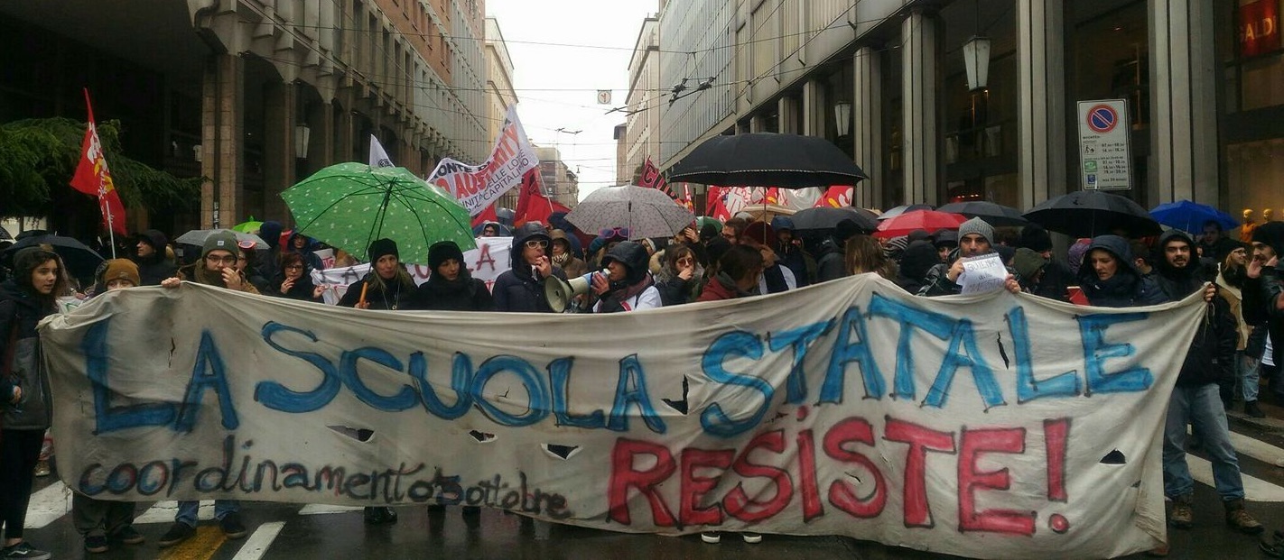«Sulla vertenza delle maestre e sulle schifezze dell’alternanza scuola-lavoro è stato detto tanto – dice Becchetti, a margine del corteo – e non mi sento di aggiungere nulla: condivido ogni parola. Questa è l’ennesima dimostrazione di come la nostra classe dirigente considera l’istruzione. Vorrei solo aggiungere un paio di considerazioni sullo stato comatoso dell’università italiana. È chiaro che dalla riforma Berlinguer del 2000, passando per Moratti e Gelmini, si è imposta un’inversione di tendenza di portata storica: l’obiettivo dell’università per tutti (raggiunto con le tante lotte studentesche degli anni Sessanta e Settanta) è stato oggi sostituito dall’università-azienda, nella quale le retoriche del “merito” e della “valutazione” fanno da padrone. Ma il merito senza uguaglianza non è merito, è privilegio. E che senso hanno le valutazioni sulla qualità quando si riducono drasticamente le risorse? Semplice: condannare e, di conseguenza, dismettere la comunità universitaria nel suo complesso: studenti, ricercatori precari, personale tecnico-amministrativo, docenti incardinati».