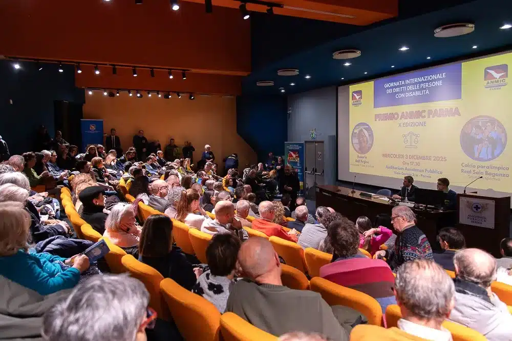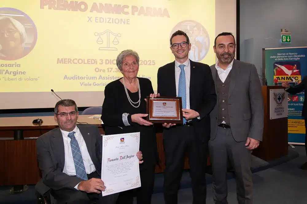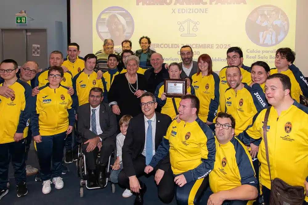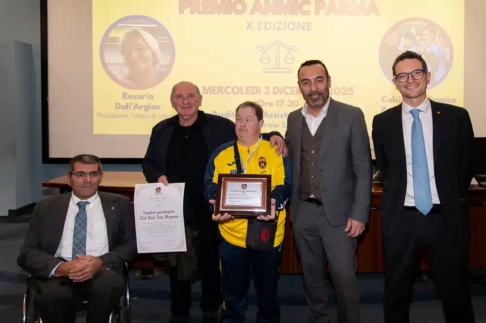 È stato consegnato a Rosaria Dall’Argine e alla squadra di calcio paralimpico dell’Usd Real Sala Baganza, ieri in un auditorium dell’Assistenza Pubblica strabordante di persone e di entusiasmo, il Premio Anmic Parma 2025, durante la tradizionale cerimonia annuale nella Giornata Internazionale dei Diritti delle Persone con Disabilità. Si tratta della decima edizione del riconoscimento che la sezione di Parma dell’Anmic, l’ente nazionale di tutela e rappresentanza delle persone con disabilità, consegna a persone che si sono distinte per aver accresciuto in maniera significativa il valore culturale, sociale, civile della nostra comunità, grazie alle proprie azioni sul fronte dei diritti delle persone con disabilità e della loro inclusione.