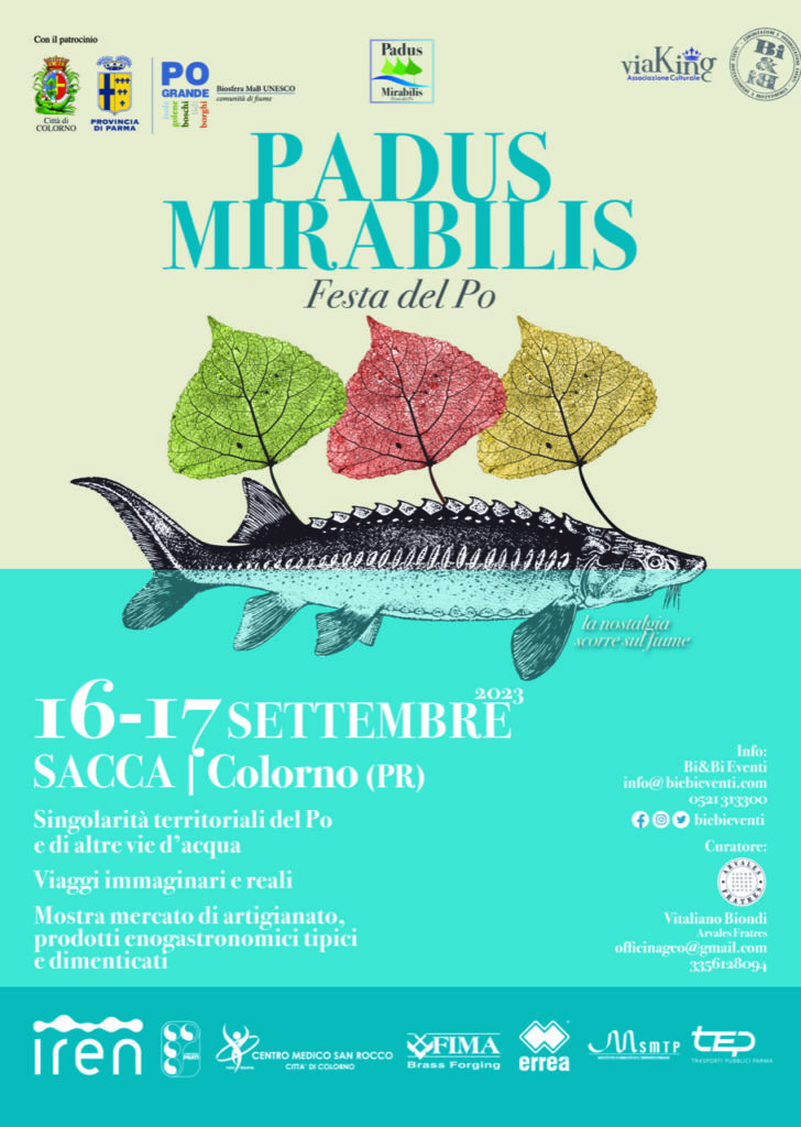 Il Grande fiume ha rapito nel corso degli anni il cuore di studiosi, viaggiatori, intellettuali e artisti che ne hanno raccontato le meravigliose suggestioni e tradizioni. Il 16 e 17 settembre 2023 a Sacca di Colorno, antica frazione di Colorno situata sul Po, a soli pochi minuti dalla prestigiosa Reggia, torna Padus Mirabilis. Festa delle singolarità territoriali del Po e di altre vie d’acqua.