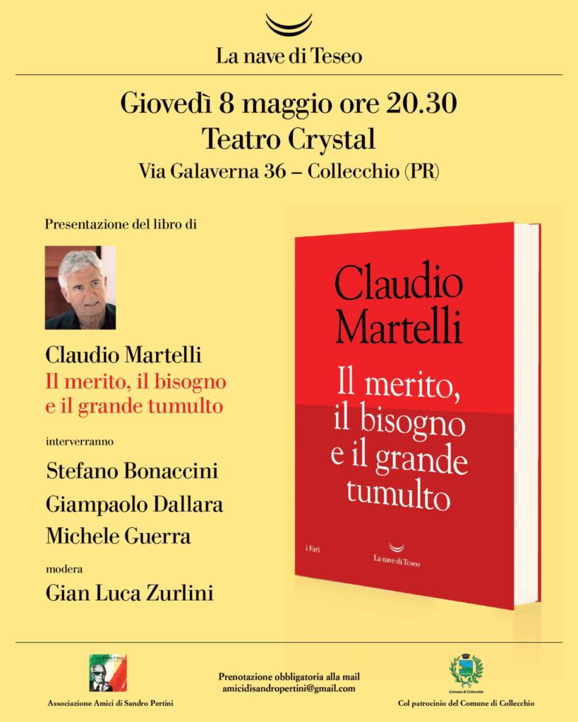 Presentazione del libro di Claudio Martelli a Collecchio di UG 7 Maggio 2025 7 Maggio 2025 122 Giovedì 8 maggio alle ore 20.30 presso il Teatro Crystal a Collecchio si terrà la presentazione del libro di Claudio Martelli “Il merito, il bisogno e il grande tumulto”. Interverranno Stefano Bonaccini, Giampaolo Dallara e Michele Guerra. Prenotazione obbligatoria all’email amicidisandropertini@gmail.com.