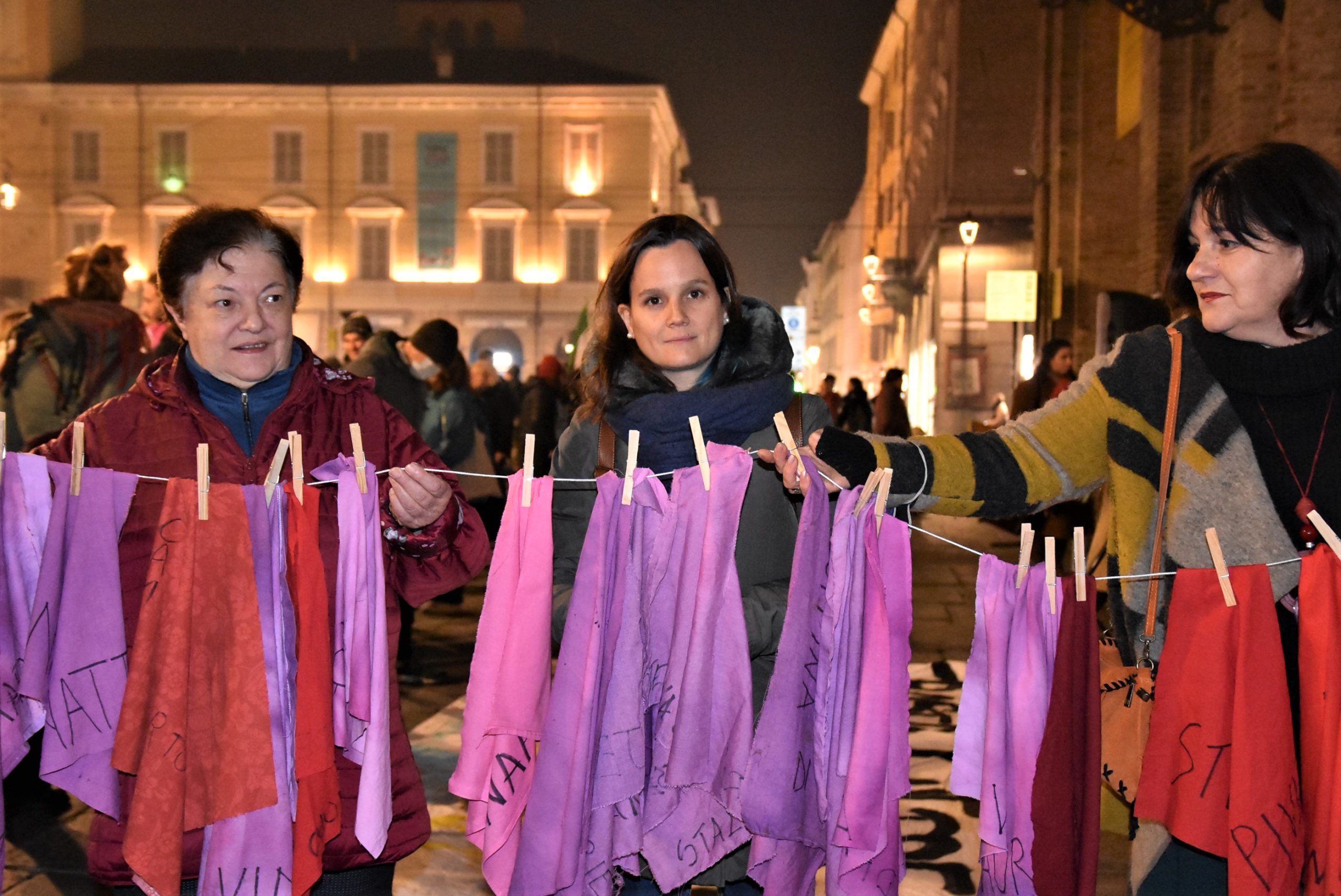 Anche l’Assessora alle Pari Opportunità del Comune di Parma Caterina Bonetti ne ha aggiunto uno. “Essere qui in tanti e tante è un segnale di consapevolezza, una riuscita iniziativa di sensibilizzazione che continuerà lasciando sventolare i fazzoletti rosa sotto i Portici del Grano e davanti alle scuole. Il nostro impegno è visibile in maniera forte oggi, ma sentito e costante anche in tutti gli altri giorni”.