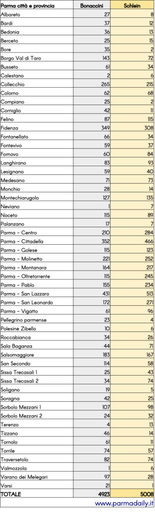Elly Schlein ha vinto le primarie in provincia di Parma raccogliendo 5.008 voti. Stefano Bonaccini si è fermato a 4923.