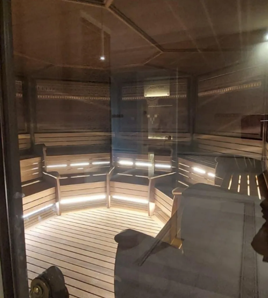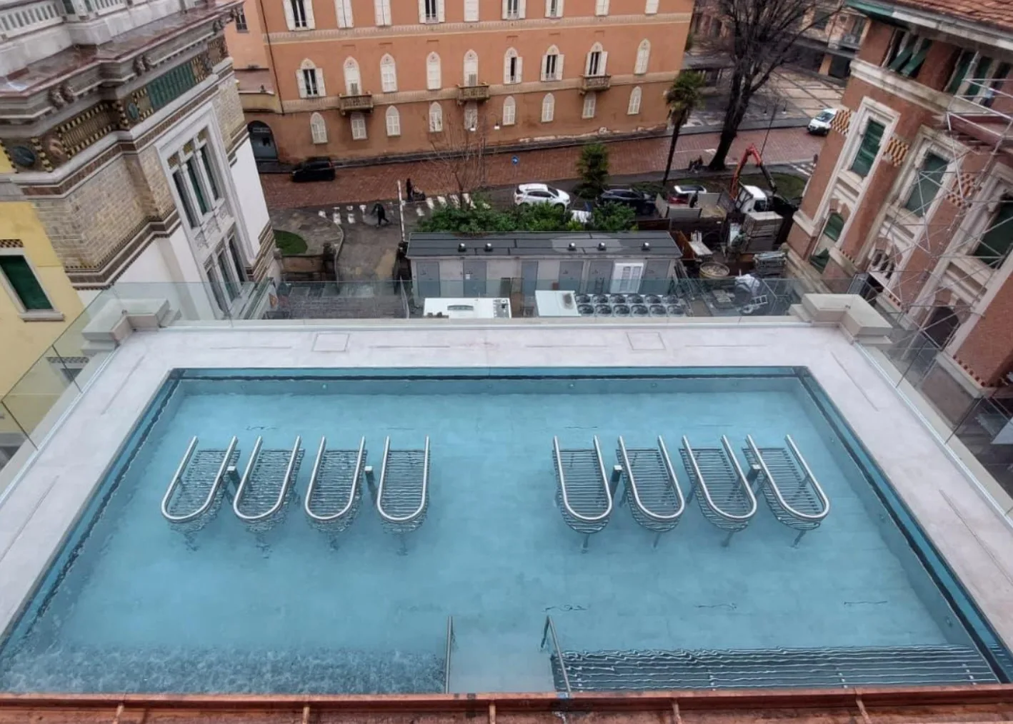 Riparte dall’ingresso monumentale, che introduce a una sequenza di ambienti storici – sale relax, biosaune, lounge massaggi e bistrot – in cui il recupero delle cromie e delle dorature dialoga con un allestimento sobrio e rispettoso: il nuovo inserito non compete, ma incornicia le decorazioni storiche, restituendo profondità alla narrazione del luogo.”