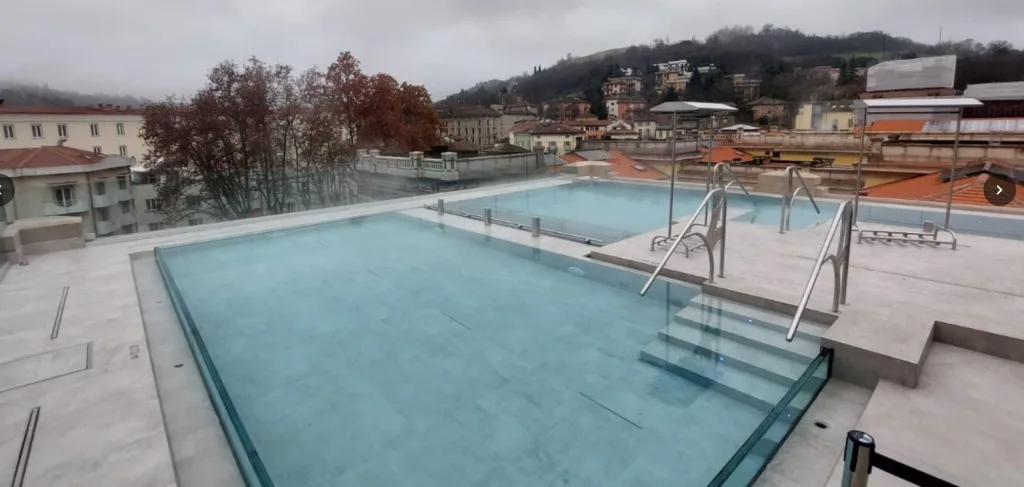 “Accanto al palazzo, l’ex centrale termica sorprende con una scenografia avveniristica: vasche su più livelli, lucernari, ponti sospesi, terrazze a doppia altezza e tre piscine panoramiche sul tetto con vista mozzafiato sulle colline emiliane.