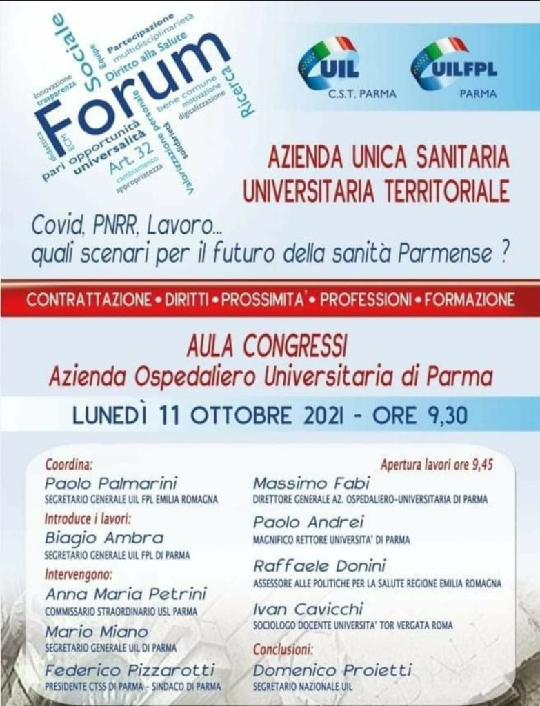 Quale futuro per la sanità di Parma? Conferenza della UIL in Ospedale di UG 10 Ottobre 2021 10 Ottobre 2021 77 “Covid, PNRR, lavoro… quali scenari per il futuro della sanità parmense?”. Sarà un incontro di alto livello quello che si terrà lunedì 11 ottobre alle ore 9.30 all’Aula congressi dell’Ospedale di Parma. La conferenza, aperta al pubblico, è stata organizzata dal sindacato Uil di Parma.
