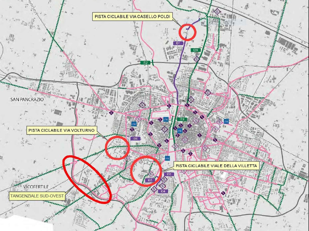 Proseguono gli interventi per ampliare la rete di piste ciclabili cittadine con 4 nuovi itinerari che collegano tratti esistenti, quali il collegamento in Tangenziale Sud fra Parma Mia e strada Martiri della Liberazione a Vicofertile; viale della Villetta, dall’ingresso principale del Cimitero a via Chiavari; via Volturno, da via Fleming a Cà Peschiere e, in fine, l’intervento in via Casello Poldi, come ricucitura conclusiva di via Europa.