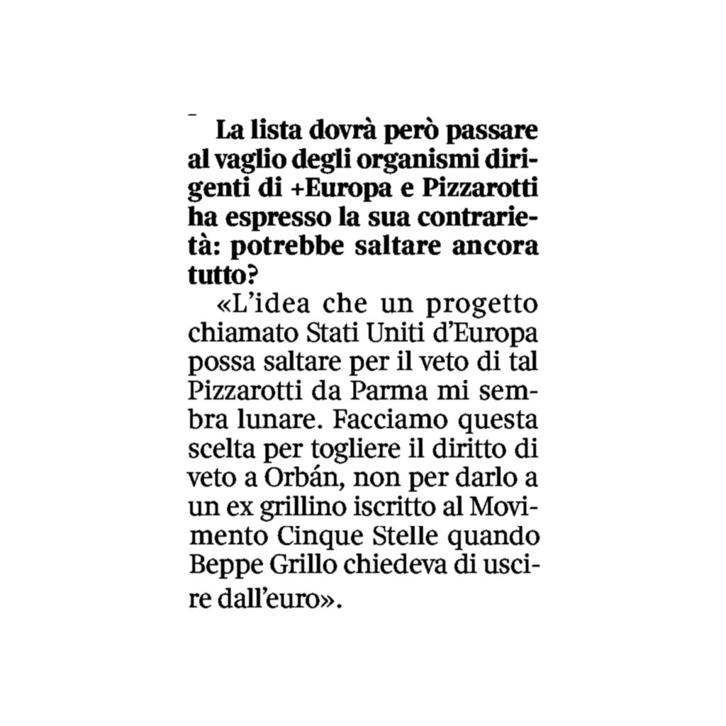 Come Più Europa parteciperà alle Europee lo decideranno gli organi secondo le regole che abbiamo, non le tue interviste. Non sono mai stato No-euro, come capitato anche a te abbiamo fatto parte di partiti di cui non abbiamo condiviso la linea e da cui siamo usciti. Firmato: tal Pizzarotti da Parma.“