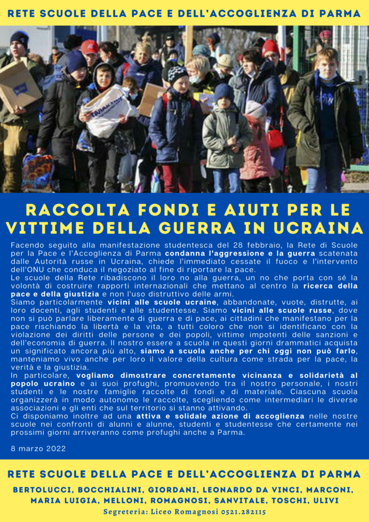 Facendo seguito alla manifestazione studentesca del 28 febbraio, la Rete di Scuole per la Pace e l’Accoglienza di Parma condanna l’aggressione e la guerra scatenata dalle Autorità russe in Ucraina, chiede l’immediato cessate il fuoco e l’intervento dell’ONU che conduca il negoziato al fine di riportare la pace.