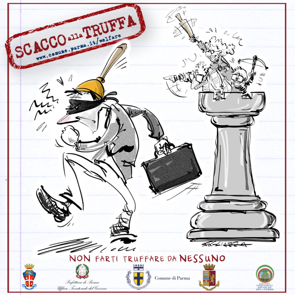 Riparte la campagna di comunicazione “Scacco Alla Truffa”, realizzata con la collaborazione del disegnatore parmigiano Gianluca Foglia, in arte Fogliazza, frutto del Protocollo d’Intesa nato nel 2021 e rinnovato anche per il 2023, firmato dal Comune e la Prefettura di Parma per la prevenzione e il contrasto delle truffe agli anziani, ma anche ai cittadini di tutte le età.