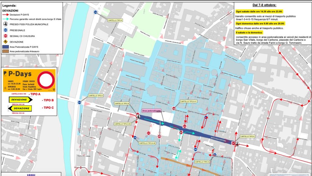 Il sabato e la domenica sarà consentito l’accesso in area pedonalizzata ai veicoli dei residenti di borgo San Vitale, borgo del Carbone, piazzale del Carbone e via Nazario Sauro, nel tratto tra strada Farini e borgo Giacomo Tommasini.