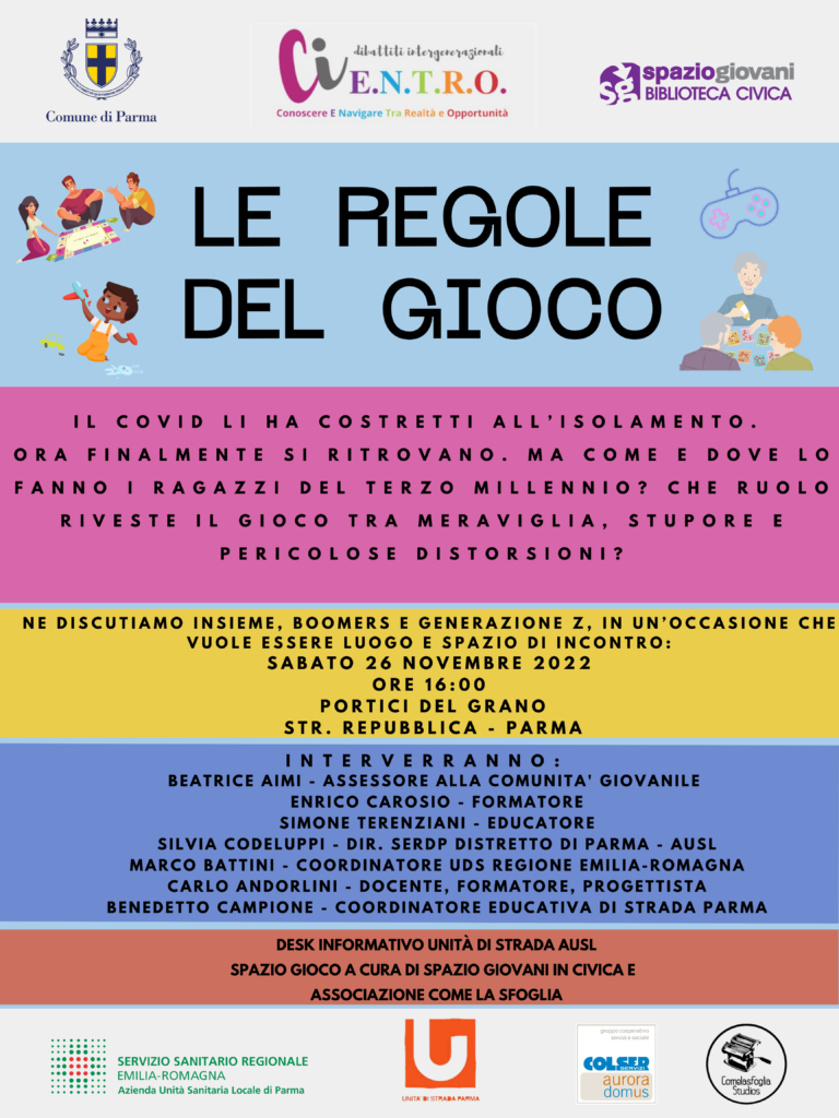 Verrà allestita, dalla rete dei Centri Giovani del Comune di Parma una zona dedicata e finalizzata ad offrire alla cittadinanza un’occasione concreta di condivisione intergenerazionale dei valori del gioco, a cui sarà affiancato un desk informativo dall’Unità di Strada dell’AUSL di Parma sui progetti e le