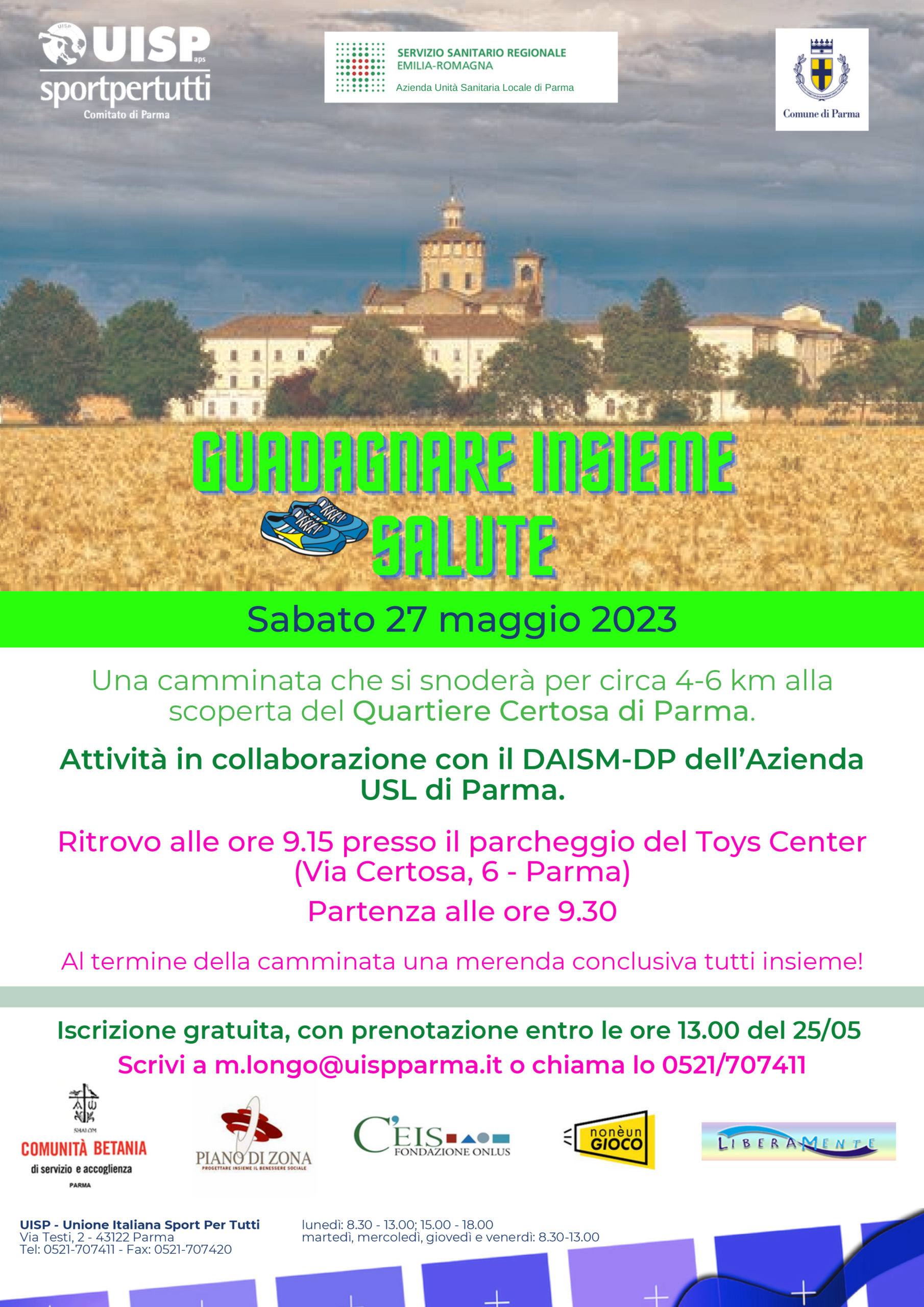 Nuovo appuntamento con “Guadagnare insieme salute”, la camminata proposta da Azienda Usl, Comune di Parma e UISP Sportpertutti che sabato 27 maggio arriva nel quartiere Certosa.