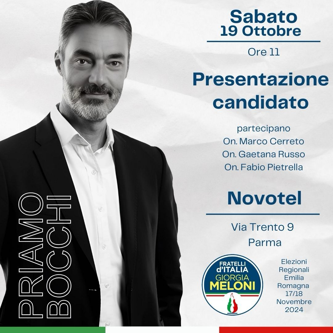 Domani, sabato 19 ottobre, alle ore 11 presso il Novotel di via Trento 9 si terrà la presentazione della candidatura al consiglio regionale nella lista di Fratelli d’Italia di Priamo Bocchi.