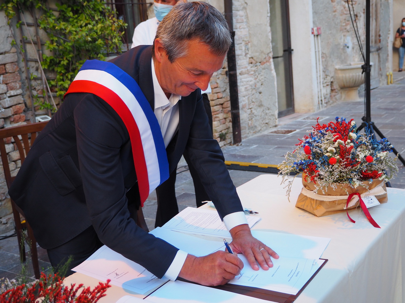 Davanti al primo cittadino transalpino, Spina ha reso omaggio alla Francia attraverso i valori della sua rivoluzione, libertà, uguaglianza e fratellanza, «che ispirarono le prime forme di Costituzioni in Italia alla fine del ‘700, l’esperienza risorgimentale e rappresentano uno dei riferimenti ideali della nostra recente storia repubblicana. Ciò che sta alla base del patto che ufficializziamo oggi, è il piacere di conoscere e condividere, il riconoscimento che a differenza delle esperienze è ricchezza».  Uniti nella diversità, quindi, che è poi il principio dell’Europa in cui le differenti identità si integrano anche con processi “dal basso” come i gemellaggi, ha ribadito anche Frignani.