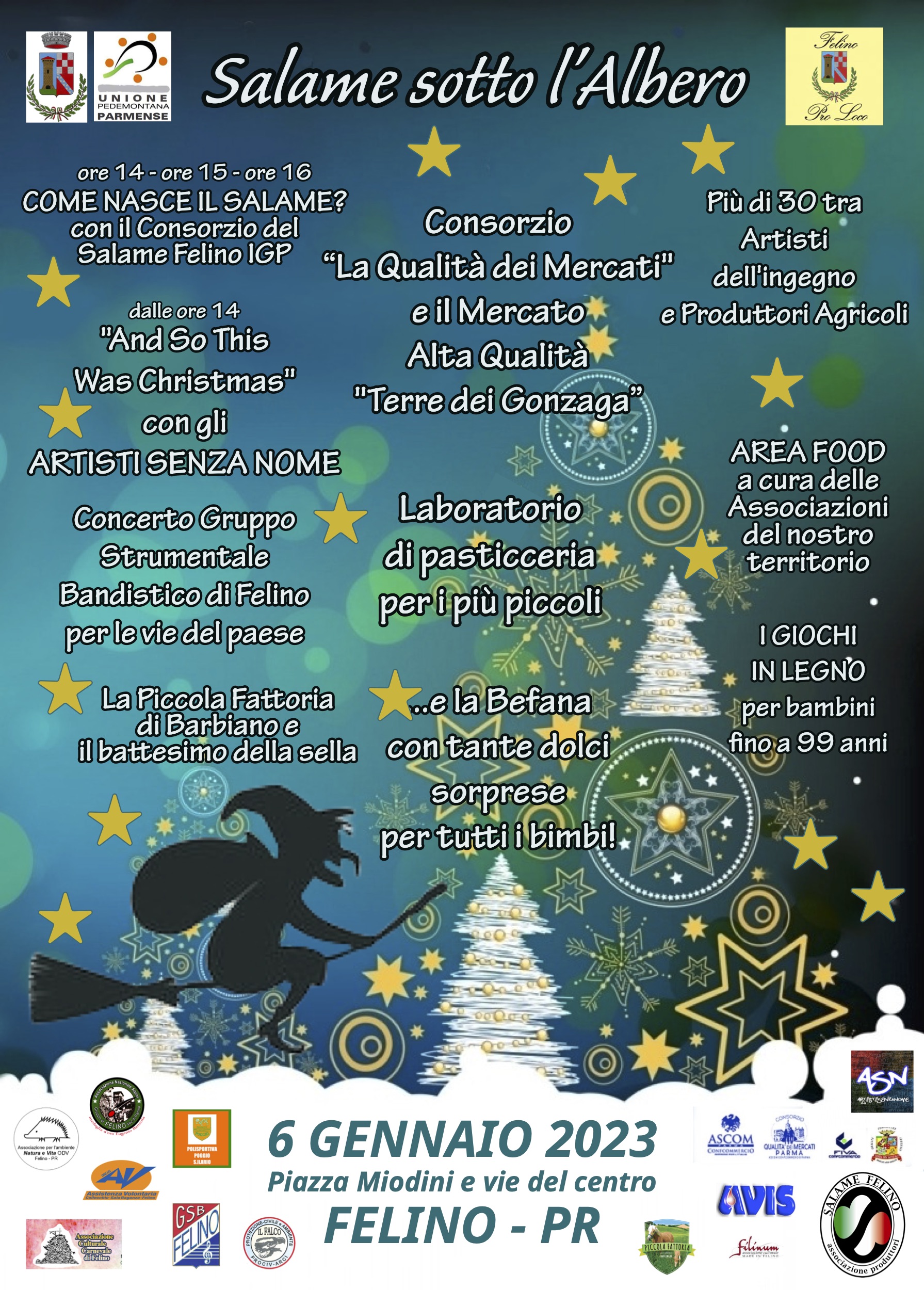 “Salame sotto l’Albero” in centro a Felino di UG 2 Gennaio 2023 2 Gennaio 2023 99 Salame sotto l’Albero! Il 6 gennaio 2023 Piazza Miodini e vie del centro di Felino si riempiranno di musica, artisti e buon cibo!