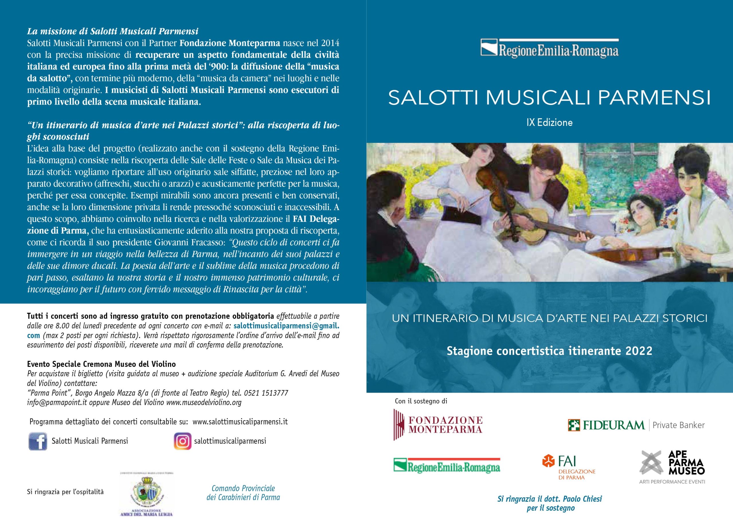 Torna anche quest’anno la rassegna concertistica “Salotti Musicali Parmensi. Un itinerario di musica d’arte nei palazzi storici”, giunta alla IX edizione. Organizzata dall’Associazione Salotti Musicali Parmensi con il sostegno di Fondazione Monteparma — a fianco della manifestazione fin dal suo esordio nel 2014 – e con i contributi di Regione Emilia-Romagna e Banca Fideuram, la rassegna ha saputo crescere di anno in anno, affermandosi nel panorama musicale locale, e non solo, come un apprezzatissimo appuntamento culturale. «Fondazione Monteparma continua con soddisfazione a sostenere la rassegna “Salotti Musicali Parmensi” che oggi conta centinaia di affezionati, grazie all’originalità e all’elevata qualità delle esecuzioni musicali proposte» — afferma Mario Bonati, Presidente di Fondazione Monteparma.