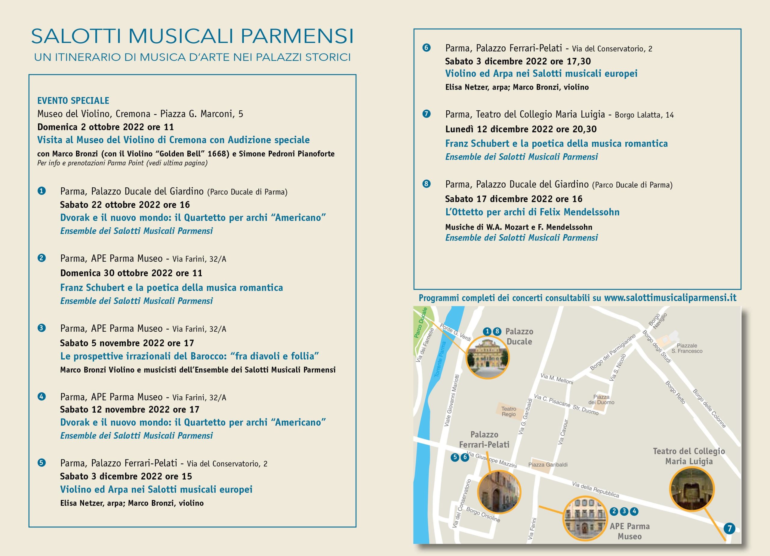 La rassegna prenderà il via domenica 2 ottobre alle ore 11 con un evento di apertura a Cremona, dove è prevista una Visita al Museo del Violino con Audizione speciale a cura di Marco Bronzi (col il violino “Golden Bell”1668) e Simone Pedroni (pianoforte). Sabato 22 ottobre al Palazzo Ducale del Giardino di Parma alle ore 16, si terrà il concerto «Dvorak e il nuovo mondo: il Quartetto per Archi “Americano”» con l’Ensemble dei Salotti Musicali Parmensi. Tre gli appuntamenti in programma nell’Auditorium di APE Parma Museo (via Farini 32/a): domenica 30 ottobre alle ore 11, «Franz Schubert e la poetica della musica romantica»; sabato 5 novembre alle ore 17, «Le prospettive irrazionali del Barocco: “fra diavoli e follia”»; sabato 12 novembre alle ore 17, «Dvorak e il nuovo mondo: il Quartetto per Archi “Americano”».