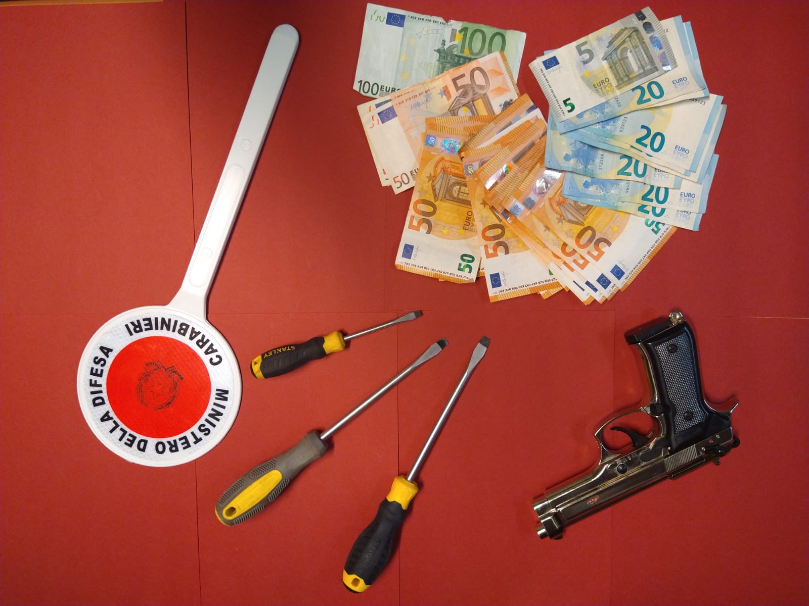 Nelle portiere laterali sono stati trovati alcuni cacciaviti mentre nelle tasche di uno dei due, la somma di circa 1.400 euro in contanti di vario taglio, di cui non riusciva a spiegarne la provenienza. I giovani, accompagnati in caserma per ulteriori accertamenti, durante e dopo le operazioni, mantenevano un atteggiamento provocatorio, proferendo minacce nei confronti della pattuglia. Al termine, sono stati denunciati per porto abusivo di armi e oggetti atti ad offendere, possesso ingiustificato di valori e minaccia a pubblico ufficiale. La pistola, i cacciavite ed il denaro sono state sequestrati in attesa di accertarne la provenienza.