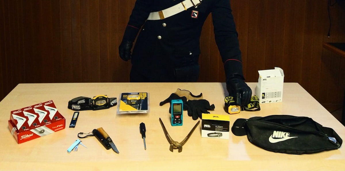 Una volta messo in sicurezza è stato sottoposto a perquisizione personale e dalla tasca dei pantaloni è spuntato un coltello con manico in legno e lama di 10 cm. A questo punto la perquisizione è stata estesa anche allo zaino che portava sulle spalle, all’interno del quale sono stati rinvenuti vari attrezzi come cacciaviti, grimaldelli, guanti, torce frontali ed una tronchese, che sono stati posti sotto sequestro.