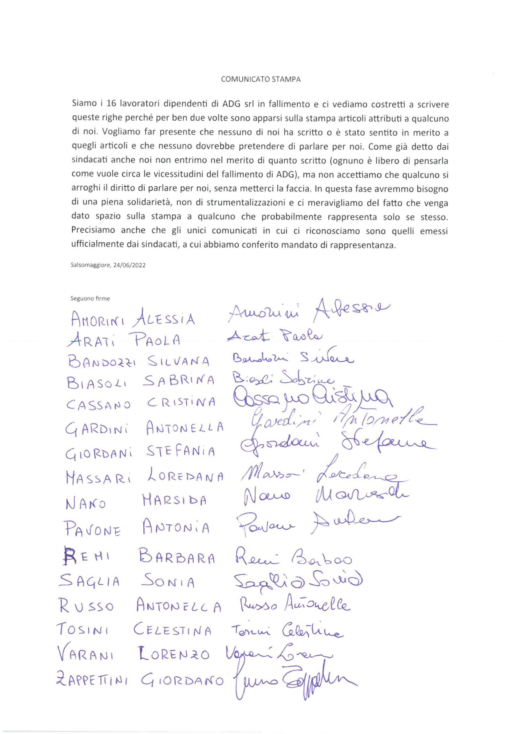 “Siamo i 16 lavoratori dipendenti di ADG srl in fallimento e ci vediamo costretti a scrivere queste righe perché per ben due volte sono apparsi sulla stampa articoli attributi a qualcuno di noi. Vogliamo far presente che nessuno di noi ha scritto o è stato sentito in merito a quegli articoli e che nessuno dovrebbe pretendere di parlare per noi. Come già detto dai sindacati anche noi non entriamo nel merito di quanto scritto (ognuno è libero di pensarla come vuole circa le vicessitudini del fallimento di ADG), ma non accettiamo che qualcuno si arroghi il diritto di parlare per noi, senza metterci la faccia. In questa fase avremmo bisogno di una piena solidarietà, non di strumentalizzazioni e ci meravigliamo del fatto che venga dato spazio sulla stampa a qualcuno che probabilmente rappresenta solo se stesso. Precisiamo anche che gli unici comunicati in cui ci riconosciamo sono quelli emessi ufficialmente dai sindacati, a cui abbiamo conferito mandato di rappresentanza”.