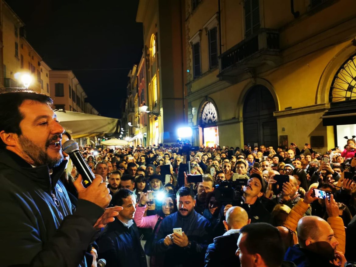 Questa sera Matteo Salvini ha organizzato un comizio in via Farini a sostegno della candidatura a Presidente della Regione Emilia Romagna Lucia Borgonzoni.