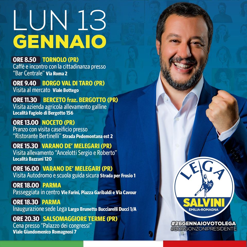 Domani (lunedì) sarà ancora in provincia di Parma: la mattina a Tornolo alle 8.50, a Borgo Val di Taro alle 9.40, a Berceto alle 11.30, a Noceto alle 13; nel pomeriggio a Varano de’ Melegari dalle 15.30, a Parma dalle 18. Alle 20.30 chiusura a Salsomaggiore Terme.