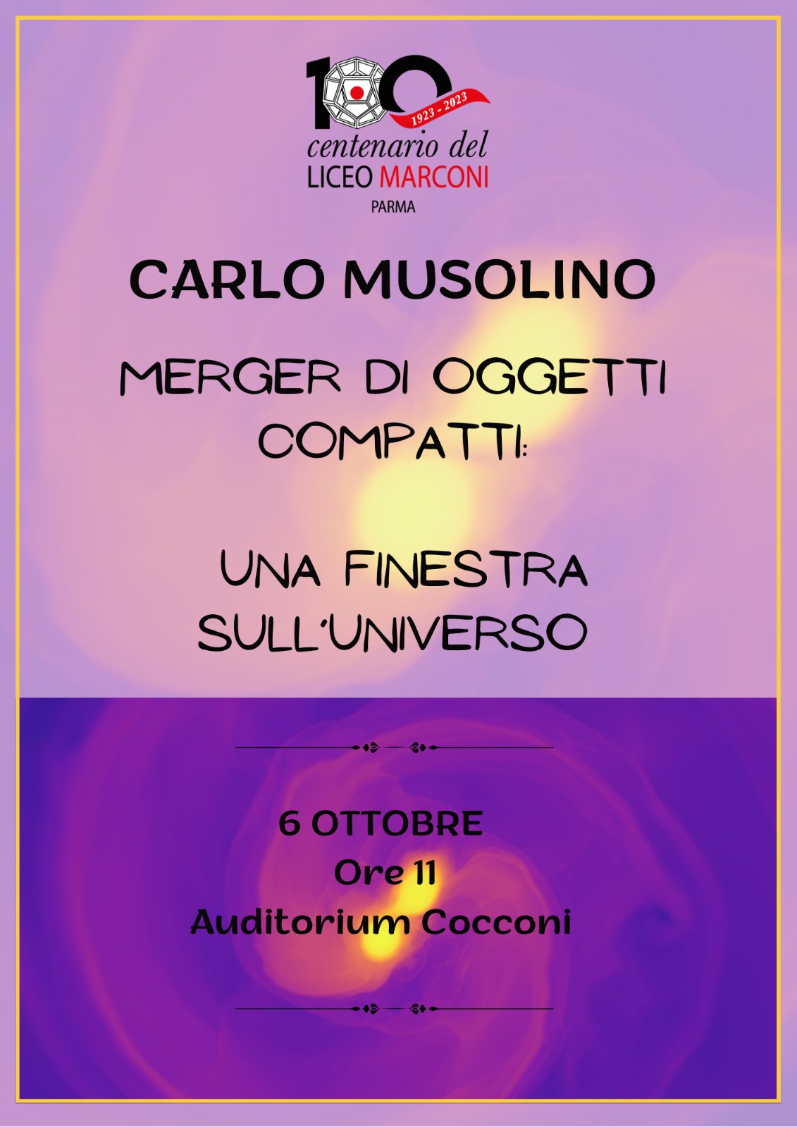 I misteri dell’universo, dalle collisioni alle onde gravitazionali ed elettromagnetiche, saranno, invece, protagonisti del secondo appuntamento “scientifico” previsto venerdì 6 ottobre, alle ore 11.00, all’Auditorium Cocconi di piazzale Picelli. A dialogare con il pubblico sarà Carlo Musolino, ex studente del Liceo Marconi e oggi ricercatore astrofisico presso il dipartimento di Fisica Teorica dell’Università di Francoforte. La lezione speciale dal titolo “Merger di oggetti compatti: una finestra sull’Universo” indagherà alcune fondamentali domande della fisica moderna, partendo proprio dall’osservazione dei fenomeni celesti.
