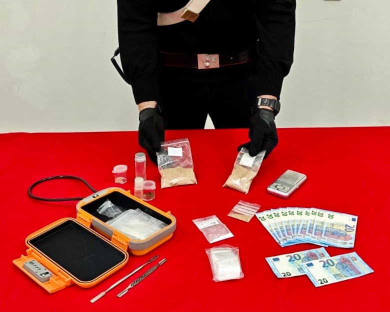 Le indagini hanno portato i Carabinieri a un appartamento in città riconducibile al 38enne. All’interno, un 67enne ha tentato di disfarsi di due confezioni contenenti 9,5 grammi di MDPV. Ma la scoperta più rilevante è arrivata da una cassaforte a muro: al suo interno sono stati sequestrati oltre 100 grammi della medesima droga già suddivisa in dosi, 1,25 grammi di ketamina, un bilancino elettronico, materiale per il confezionamento e 12 banconote da 20 euro false.