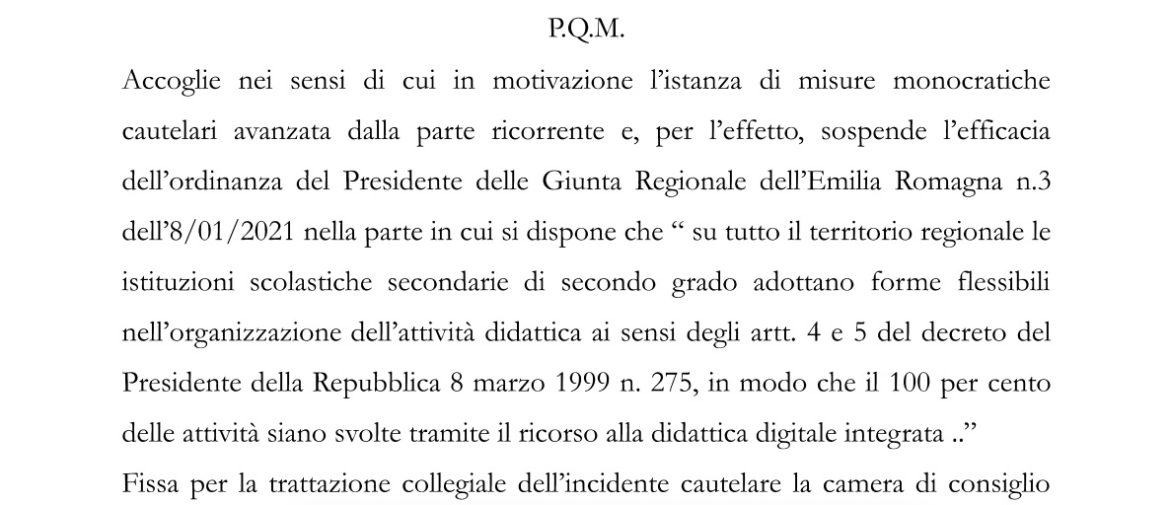Il Tar dell’Emilia Romagna ha sospeso l’efficacia dell’ordinanza del presidente Stefano Bonaccini con cui si disponeva la didattica a distanza al 100% per le scuole superiori fino al 23 gennaio.