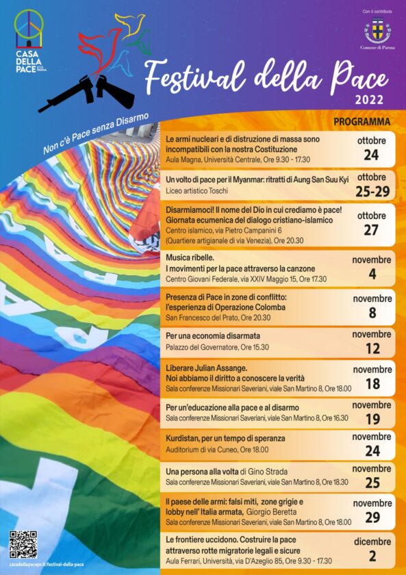 “Il Comune non solo accoglie, ma sostiene attivamente il primo Festival della Pace di Parma” vuole sottolineare l’Assessora Daria Jacopozzi con delega alla Cooperazione Internazionale e alla Pace “lunedì si aprirà in città il programma di un’iniziativa che si realizza grazie allo strenuo ed appassionato lavoro delle associazioni che animano la Casa della Pace di Parma. Il ricco calendario degli eventi testimonia come il tema pace sia complesso, da articolare quindi su temi anche molto diversi tra loro: dall’incubo del nucleare (purtroppo oggi più attuale che mai) ai regimi politici e crisi democratiche, alla libertà di parola fino alla delicatissima questione del disarmo e del commercio internazionale delle armi. Dobbiamo ragionare di pace all’interno di uno stato di conflitto, ma questo ci fa comprendere tragicamente che, senza una vera cooperazione internazionale la transizione ecologica, indispensabile per noi umani su questo pianeta, è impossibile. La prospettiva di un’economia disarmata e capace di rendere disponibili a tutti le materie prime per le energie rinnovabili è fondamentale per la sopravvivenza dell’umanità. Il Festival della Pace ci chiede di non rinunciare a sperare, ci chiede di costruire insieme una cultura di pace da esportare nel mondo che significa democrazia e partecipazione, accoglienza della diversità, giustizia sociale, mediazione dei conflitti. Su queste politiche la nostra amministrazione sarà attenta e propositiva ed inviata la cittadinanza a partecipare agli eventi programmati tra il 24 ottobre e il 2 dicembre”