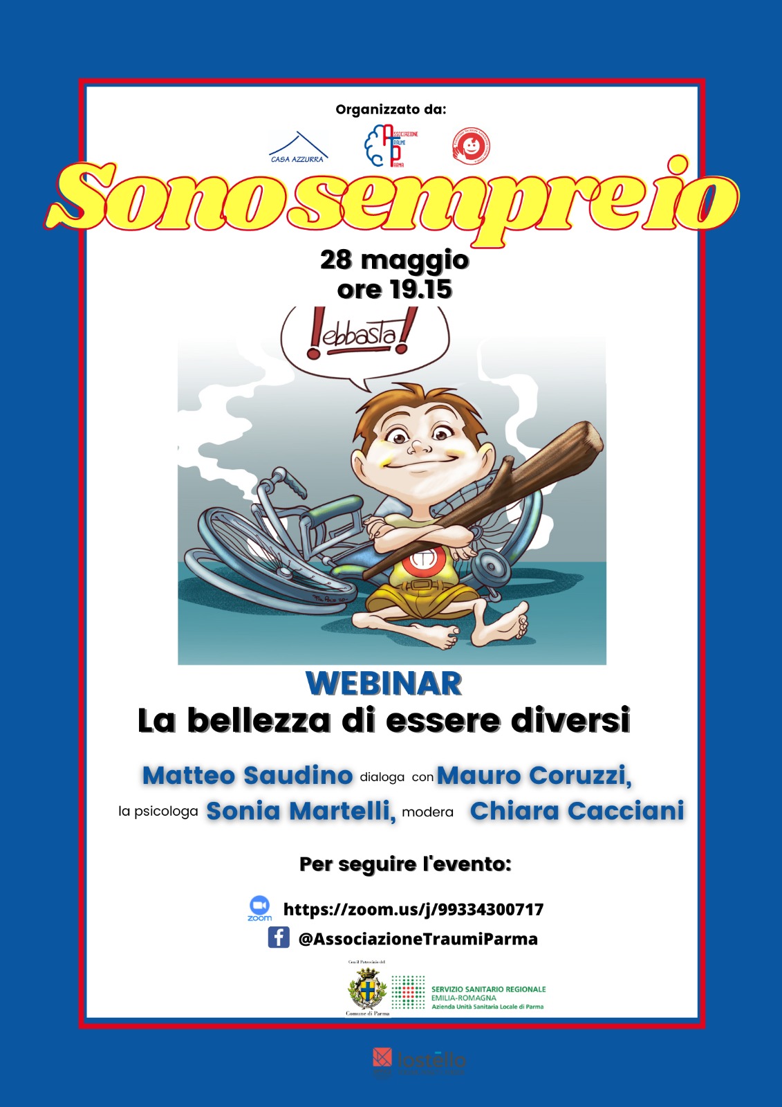 Secondo appuntamento della rassegna “Sono sempre io” con il Webinar “La bellezza di essere diversi” con il filosofo Matteo Saudino. Anche questo appuntamento sarà gratuito e online e si svolgerà venerdì 28 maggio, alle ore 19.15. Per partecipare basterà collegarsi tramite il seguente link https://zoom.us/j/99334300717 alla piattaforma Zoom, oppure seguire lo streaming dell’evento sulla pagina Facebook dell’Associazione: @AssociazioneTraumiParma.