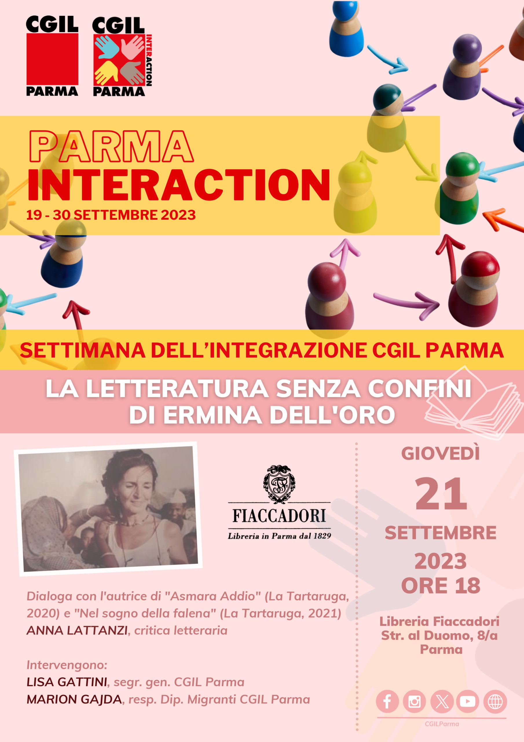 Nell’ambito della “Settimana dell’integrazione” promossa da CGIL Parma e dal suo Coordinamento Migranti per costruire occasioni di dialogo e reciproca conoscenza con le comunità straniere del territorio, è in programma per domani, giovedì 21 settembre, un incontro dedicato alla letteratura senza confini di Erminia Dell’Oro, scrittrice a cavallo tra due mondi: l’Eritrea e l’Italia.