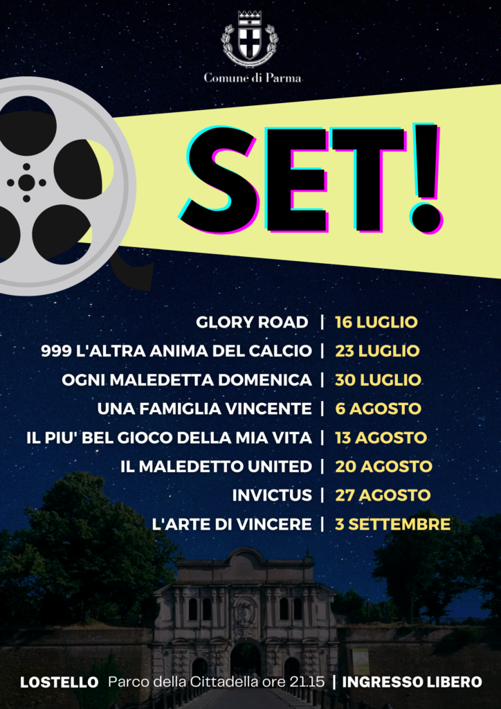 Soddisfazione è stata espressa dall’Assessore allo Sport, Marco Bosi, che ha dichiarato: “Il 16 luglio comincia SET, una rassegna di film sul tema sportivo. Si tratta di otto serate domenicali, in cui, in attesa della nuova stagione sportiva, si potrà vivere lo sport attraverso il cinema. La rassegna è a ingresso gratuito al Parco della Cittadella”.