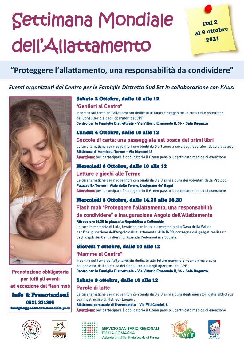 Mercoledì 6 ottobre doppio appuntamento. Si inizia nella mattinata da Lesignano de’ Bagni con “Letture e giochi alle Terme”. Le letture, dedicate ai neogenitori con bimbi da 0 a 3 anni, saranno a cura dei volontari della Proloco e si terranno nel Palazzo Ex Terme (Viale delle Terme) dalle 10 alle 12. Anche in questo caso per partecipare è obbligatorio il Green pass o il certificato di esenzione del medico. Nel pomeriggio gli eventi si concentreranno a Collecchio. Alle 14.30, con ritrovo in piazza della Repubblica, si svolgerà il flash mob “Proteggere l’allattamento, una responsabilità da condividere”. Seguirà poi una lettura in memoria di Lola, levatrice condotta molto conosciuta in paese, al termine della quale si raggiungerà con una camminata la Casa della Salute dove verrà inaugurato l’Angolo dell’Allattamento. Alle 16.30 la manifestazione terminerà con la consegna alle mamme del gadget realizzato dagli ospiti dei Centri diurni di Azienda Pedemontana Sociale.